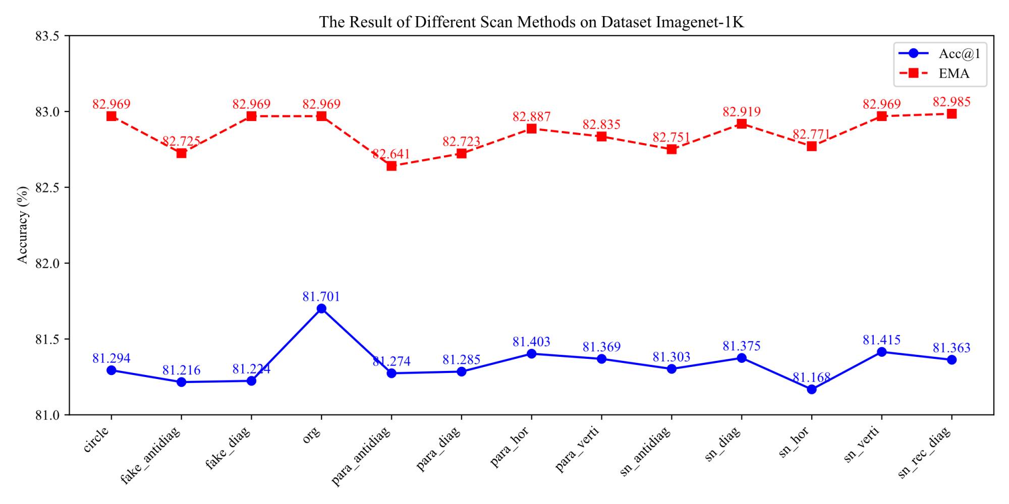 This paper proposes a total of seven completely new scanning algorithms and one combination, including four scanning algorithms and their combinations in RS-Mamba, resulting in a total of 13 different scanning methods. Compared to the original scanning algorithms, relevant experiments were conducted, and the scanning algorithm and the corresponding number of sequence scans (S6 scan sequences) for each method are listed in Table 2.