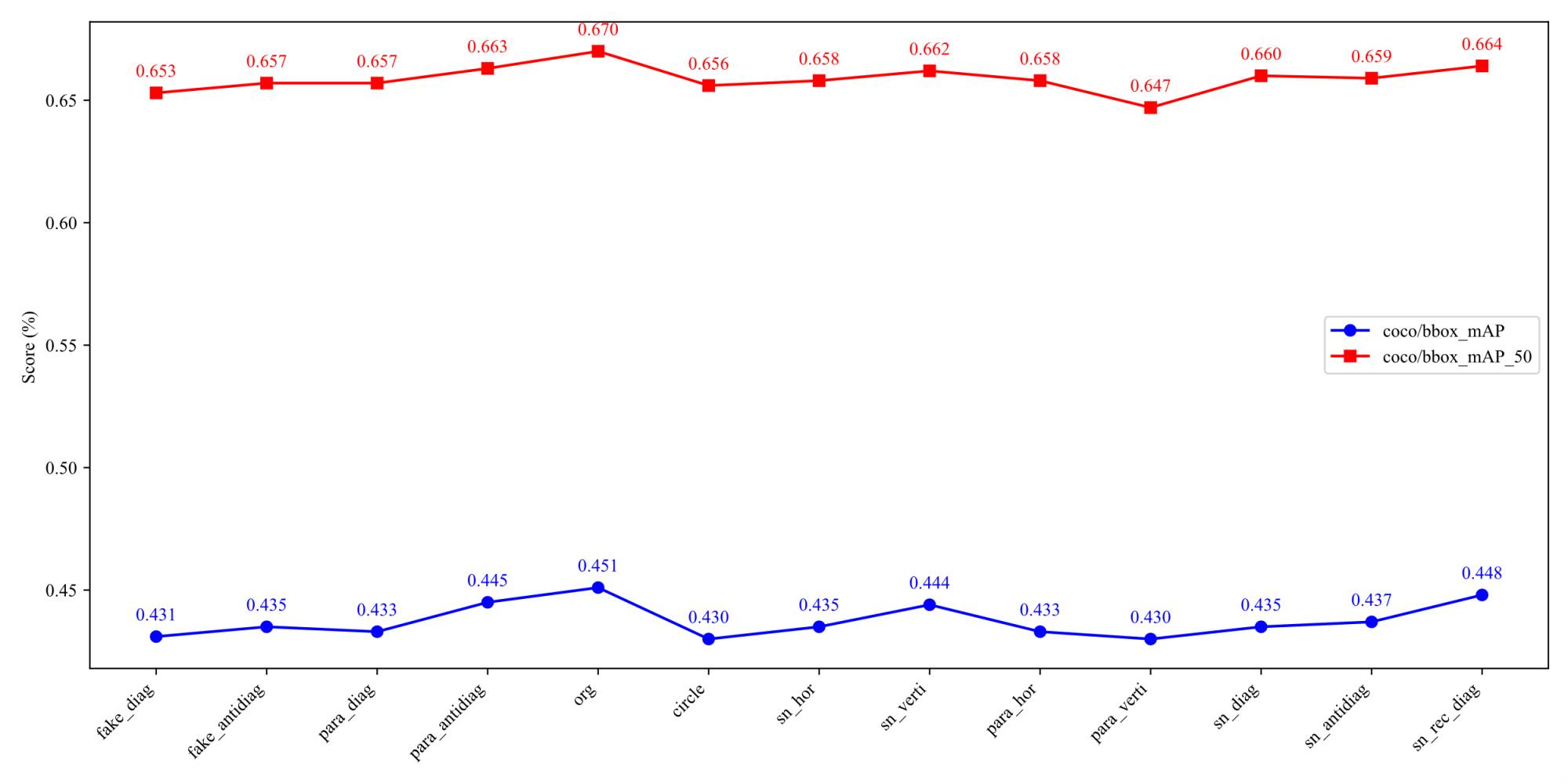 mAP (mean Average Precision): mAP is a commonly used evaluation metric for object detection models, representing the average precision of the model at different IoU thresholds. In this study, COCO/bbox_mAP_50 is used to represent the average precision at an IoU threshold of 50% in the COCO dataset to evaluate the performance of object detection tasks. The process begins by integrating the P-R curve, then using interpolation to calculate AP in the COCO dataset. For each Recall value, the maximum Precision value is taken. The calculation is given in Equation (9), and the average AP of all categories is taken to obtain the mAP, as shown in Equation (10).