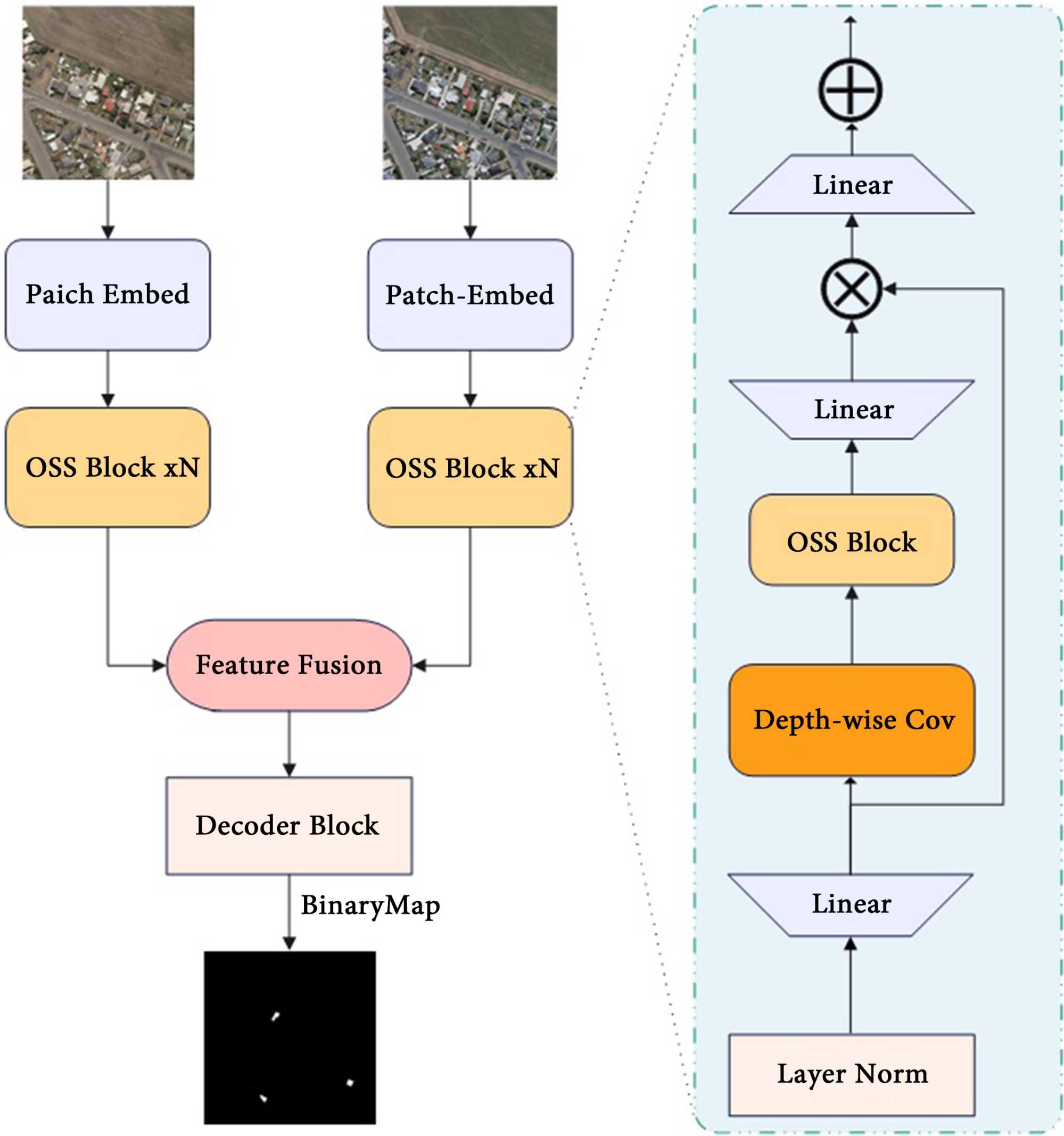 Mamba [2] is a novel deep learning architecture based on the State Space Model (SSM), initially designed for natural language processing. The standard Mamba model operates on one-dimensional sequences. To extend its capability to visual tasks, Liu et al. [3] proposed VMamba, whose core component is the Visual State Space (VSS) module, composed of the 2D Selective Scan (SS2D) algorithm. VMamba integrates the advantages of CNNs [4] and Transformers [5], enabling both local feature extraction and global modeling with high computational efficiency. Compared to Transformers, VMamba has lower computational complexity, making it highly suitable for large-scale remote sensing data processing, especially for multitemporal imagery.