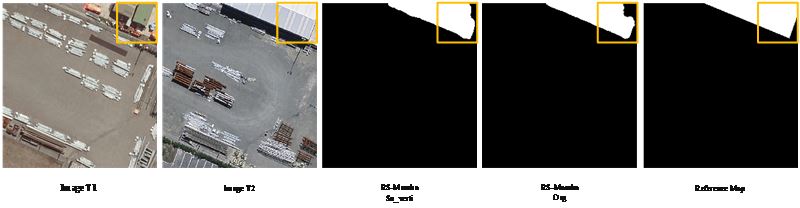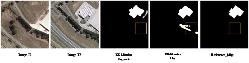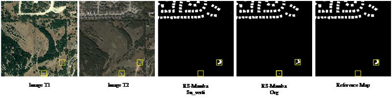 From the figures, it is evident that compared to RS-Mamba, which employs an omnidirectional scanning-based change detection model, the proposed algorithm demonstrates superior performance. This improvement is mainly reflected in fewer noise artifacts and more complete classification results, leading to an overall enhancement in change detection performance.