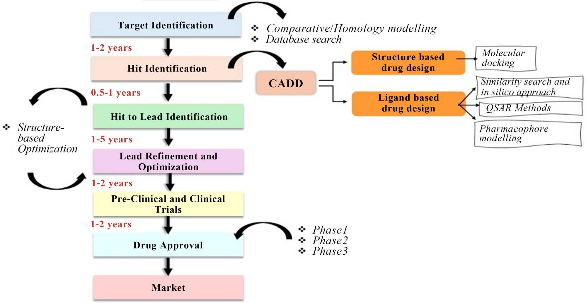 Introducing a new drug in a market is a complex, risky and costly process in terms of time, money and manpower. Generally it is found that drug discovery and development process will take 10 - 14 years and more than 1 billion dollars. To reduce time, cost, risk-borne factors, computational approach in drug design is getting very rapid exploration, implementation and admiration [13]. CADD represents computation methods and resources used to facilitate the design and discovery of new therapeutic drugs. CADD methodologies and techniques are used to calculate molecular properties to aid in drug design process. These methods use 3D structure of a ligand, a target and then design new compound as well as construct large combinational libraries of compounds that can be screened computationally before attempting to synthesize and test them [14]. CADD makes used of structural knowledge of either the target (Structure-based) or known ligands with bioactivity (Ligand-based) to facilitate the determination of promising candidate drugs [15].