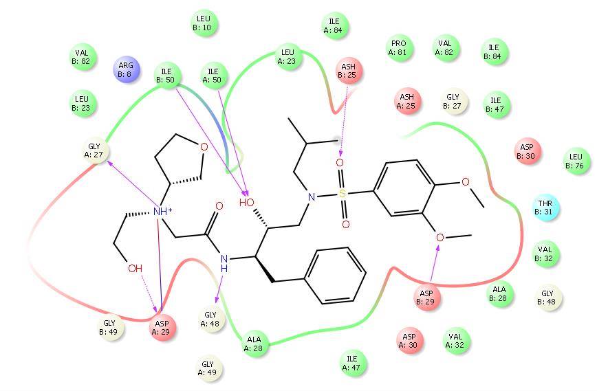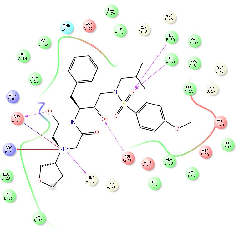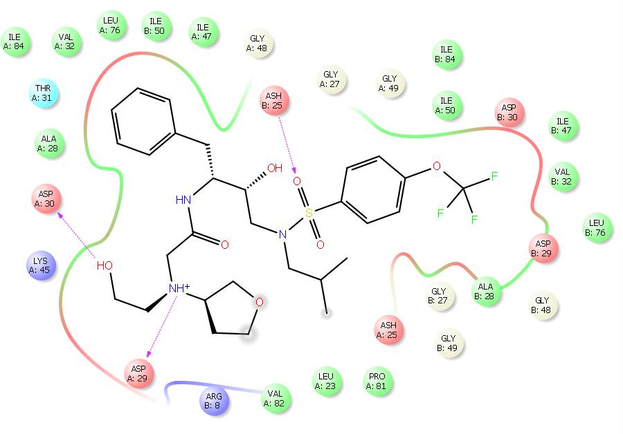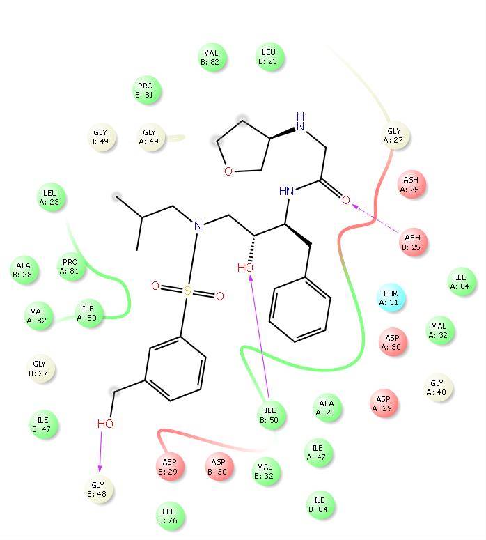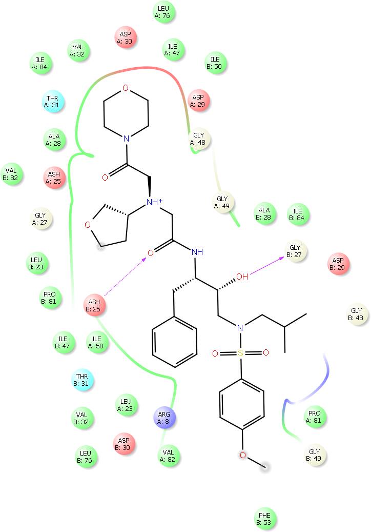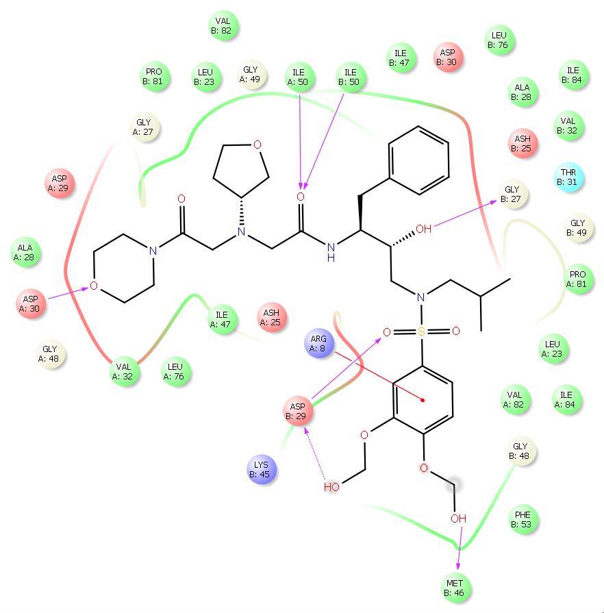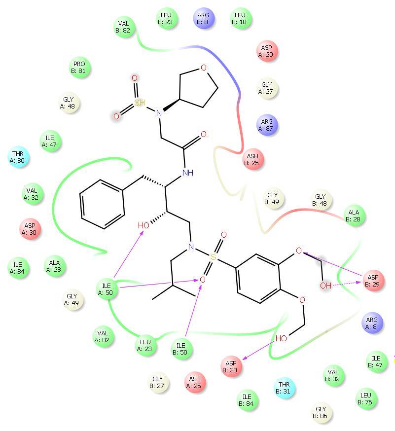 The chemical compounds investigated in this study were selected from the work of X. Bai et al. [26]. One effective design strategy of eliminating drug existence is to maximize interaction between inhibitor and the protease especially to promote extensive H bonds interaction with backbone atoms and residues in the protease active site. For example as mentioned in the work done by X. Bai et al.—For example, the stereo chemically defined P2-ligands bis-tetrahydrofuran (THF) of Darunavir (DRV), mono-THF of amprenavir (APV), tris-THF of GRL-0519 and Tp-THF of GRL-0476 introduce more hydrogen bonds through cyclic ether oxygens with main chain atoms of the protease residues in S2-subsite, such as amide NH of Asp29/Asp30. A number of potent inhibitors have been reported with a substituted-phenyl-tertiary amine-acetamide structural template, splitting from the bis-THF of DRV by scaffold hopping method, as the P2-ligand to enhance interactions with the protein backbone in the S2-subsite.