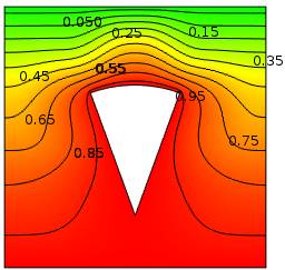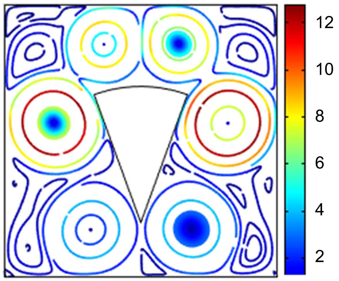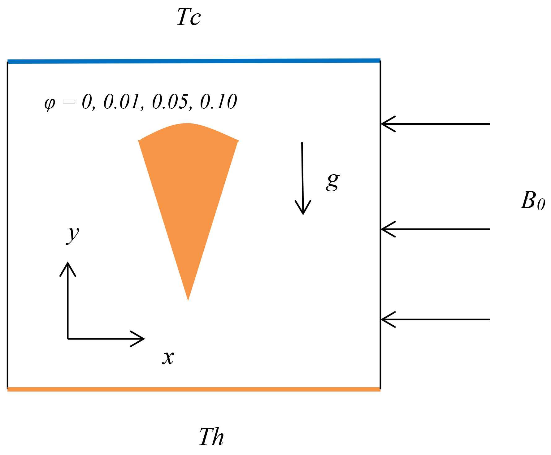 Figure 2 shows a schematic diagram of the model. The cavity is filled with an MHD fluid, in addition there is nano particles suspended in it. The left and right vertical walls of the cavity are thermally insulated, while the bottom and top walls are kept at different high (Th) and low (Tc) temperatures respectively. The heated cone is kept at vertical position only. A magnetic field of uniform intensity B0 is applied, perpendicular to the direction of flow. The gravitational force g, acts vertically downward.