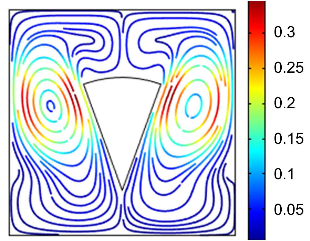 At Ra = 103, two vortices are seen on both side of the cone. The velocity varies from 0.05 to 0.5. At Ra = 104, four additional major and two minor vortices appear, and the velocities increase by an order of magnitude. Further increase of Ra to 105, total number of vortices remains the same but their shapes changed. Velocity also increased noticeably. However, the flow patterns remain symmetric around the cone for all cases.