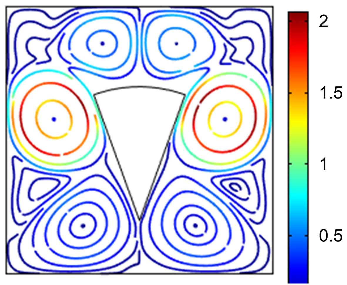 Figure 5 shows the effect of Ra on the streamlines with no nanoparticles (φ = 0) and no magnetic field (Ha = 0), as a baseline case. The streamlines represent the fluid flow pathways, while the colors represent the velocity. The velocity magnitude is indicated by the color legend shown at the right side of each figure.