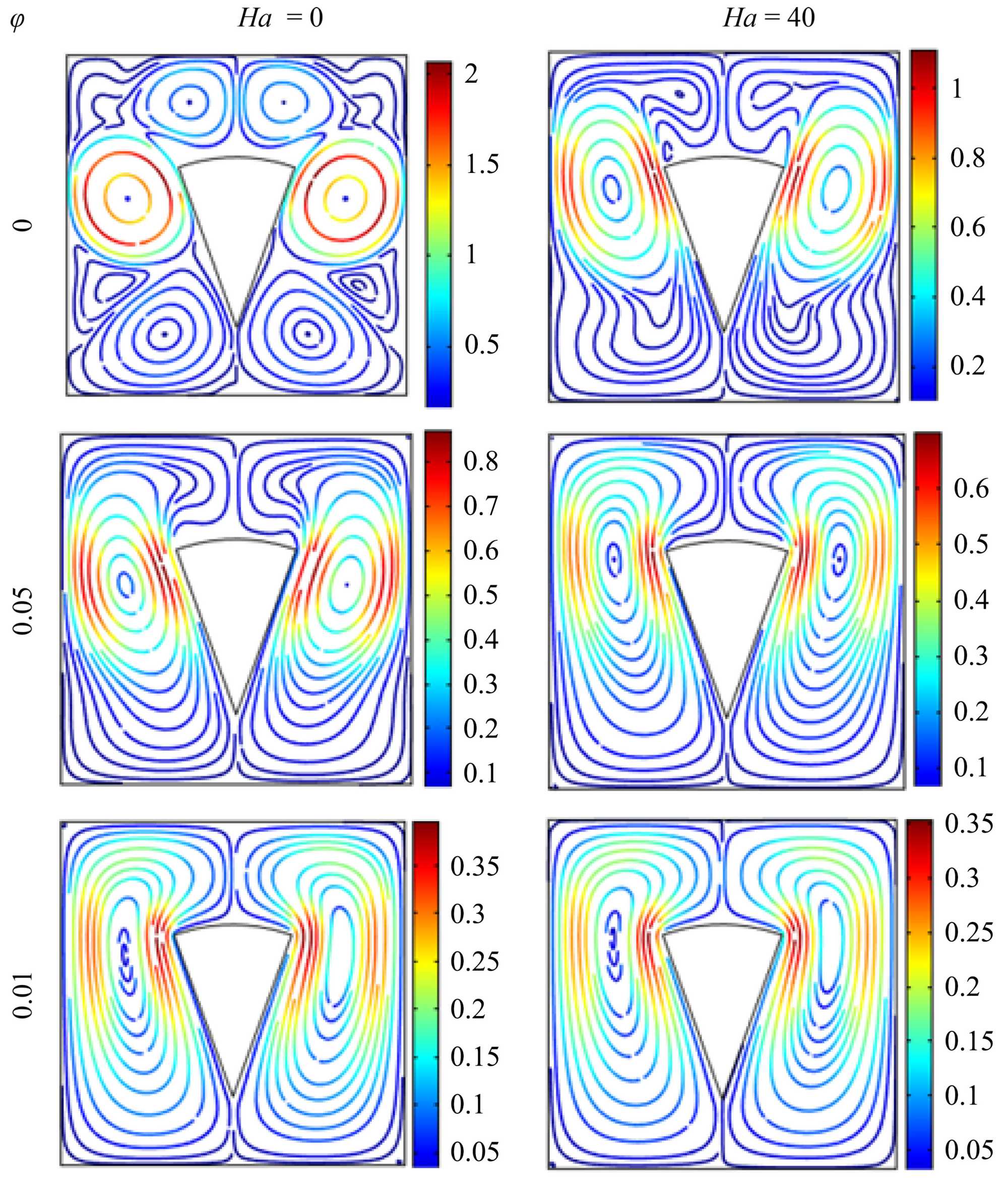 1) In addition to the Ra and Ha, the volume fraction of the nanoparticles, φ, affects the heat transfer and fluid flow in varying degrees. Increasing Ra increased circulation and heat transfer while increasing Ha had the opposite effect.