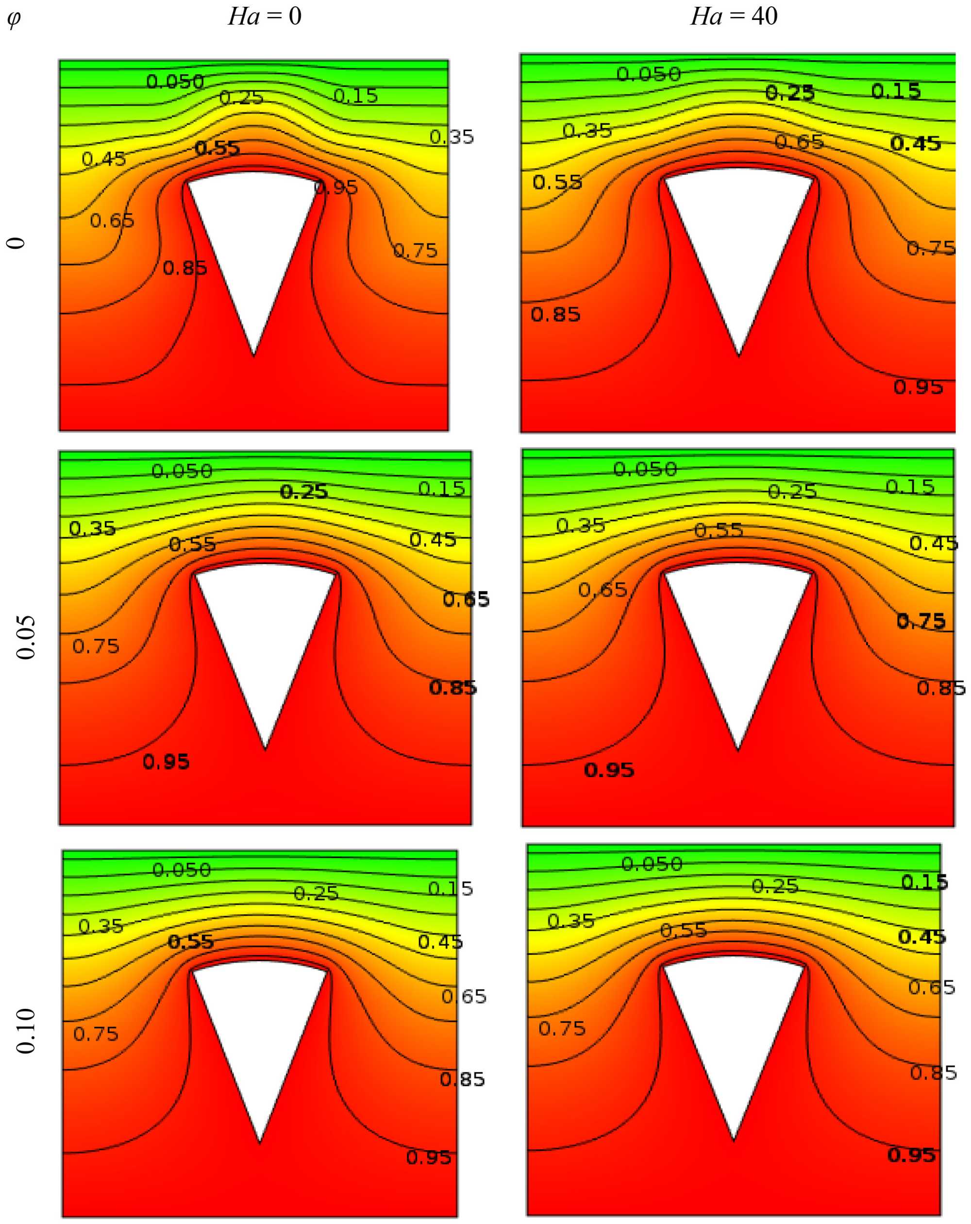 Next, Ra is kept constant at 105, and the values of φ and Ha are increased. The reason for doing this is mentioned in the previous section. The results are shown in Figure 8. It is noted that, the nano-particles have a greater influence on the temperature distribution as well, compared to that of the magnetic field. Similar to the influence on fluid movement as seen in the previous section (Figure 6).
