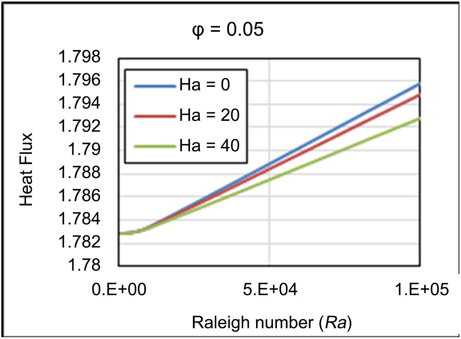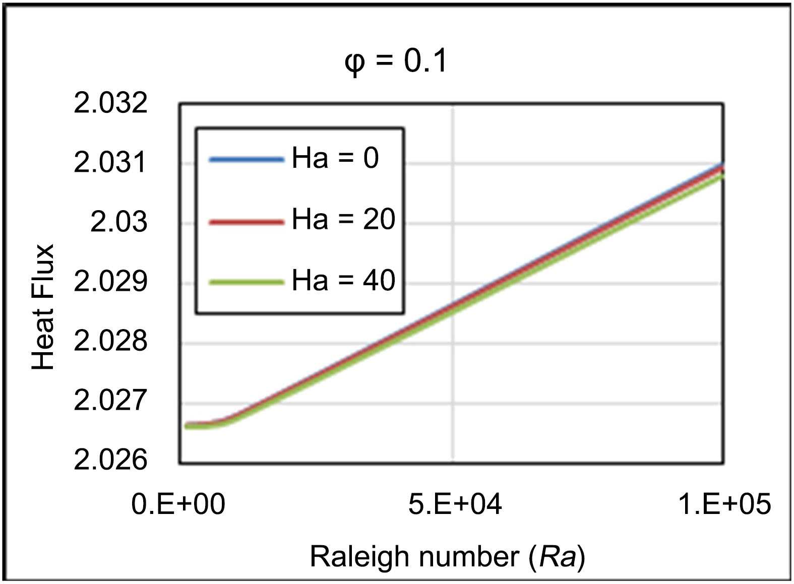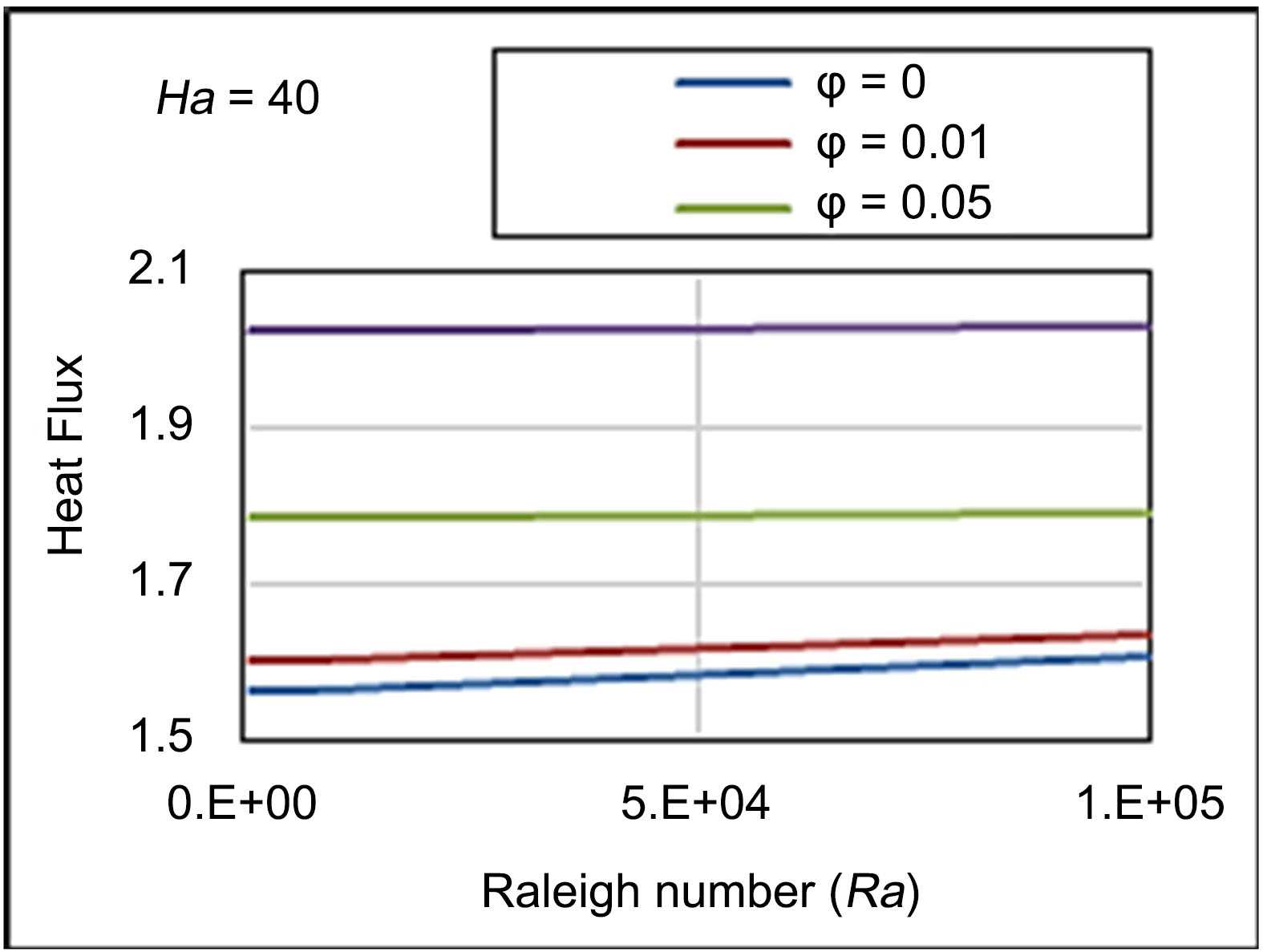 Heat flux: It is seen that in the previous figures that, adding more nanoparticle retarded flow. Increasing Hartmann number also retarded flow. Adding more nanoparticle also affected temperature distribution by making the isotherms smoother. Increasing Hartmann number also had similar effect but to a lesser degree. However, these observations are not sufficient to say conclusively whether heat transfer was enhanced or not. Therefore, Heat Flux was calculated for different values of Ra, Ha, and φ. The results are presented next in Figure 9.