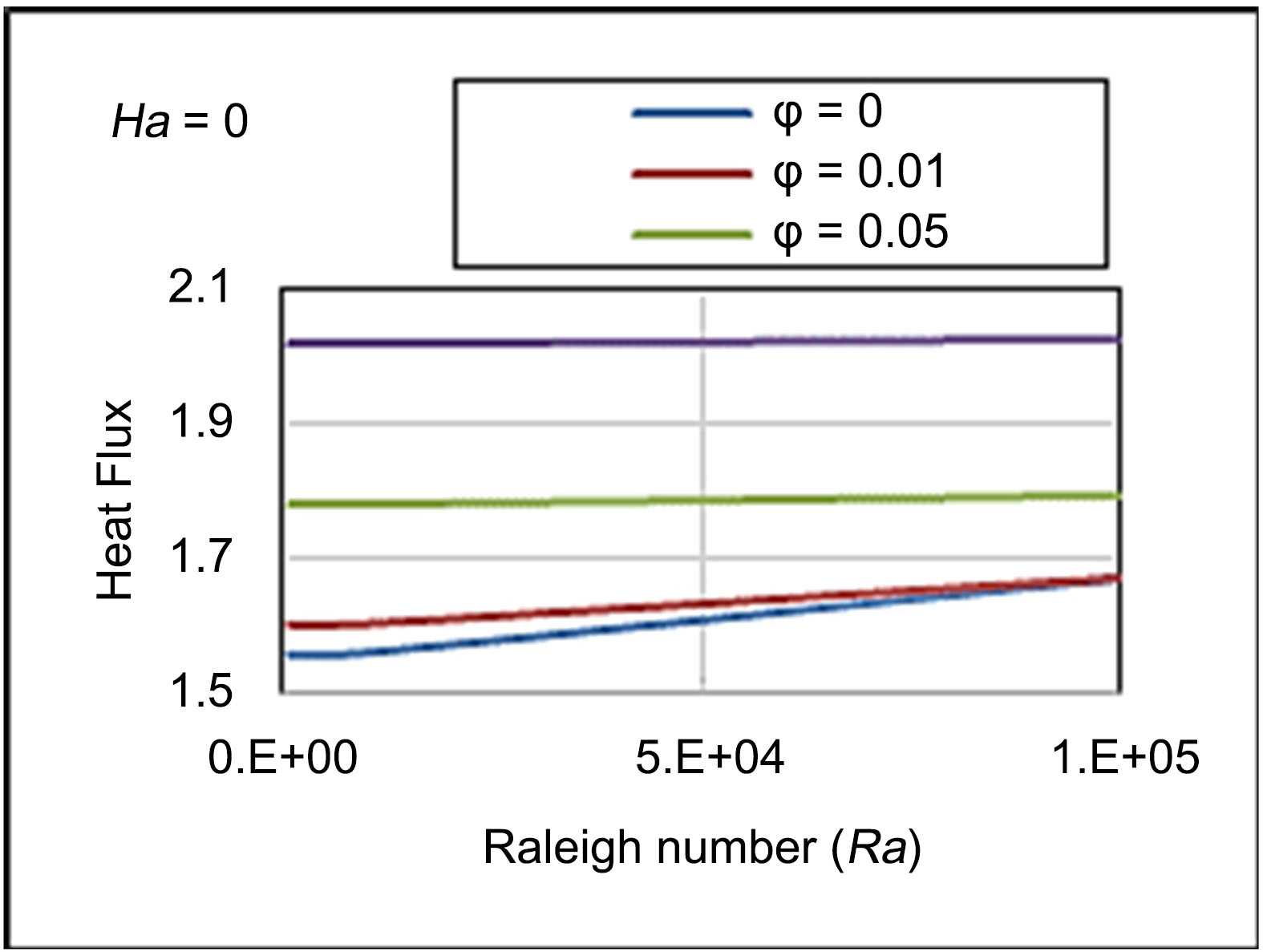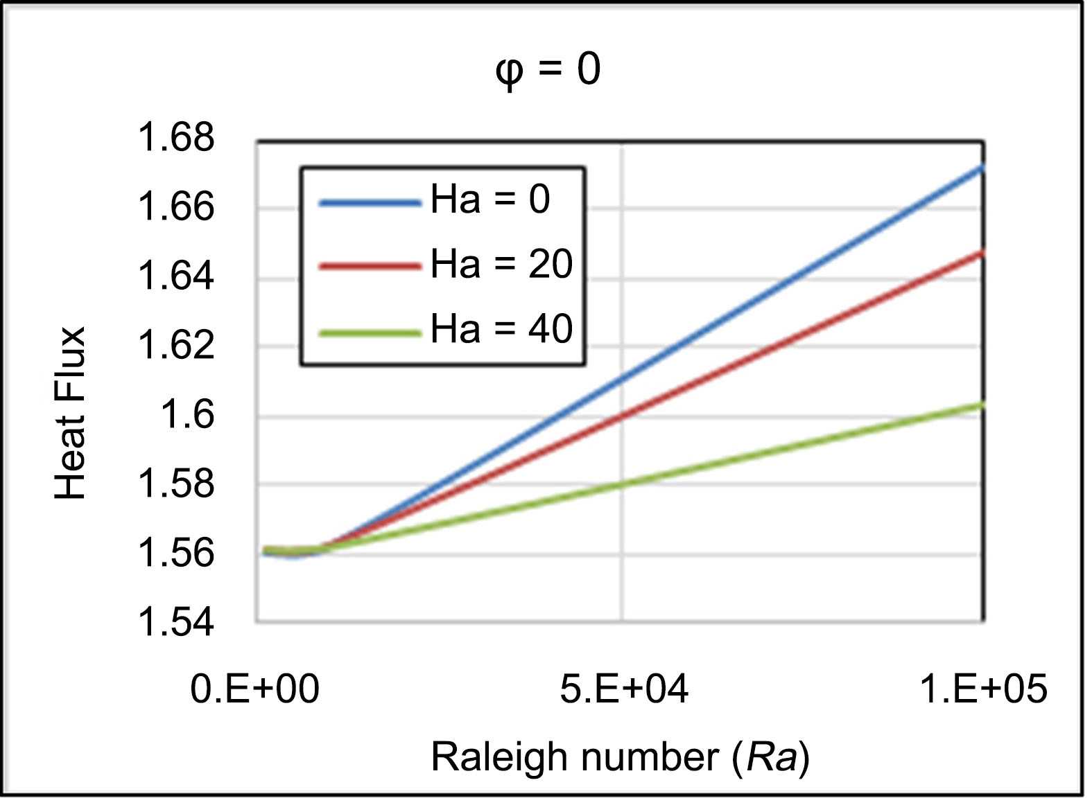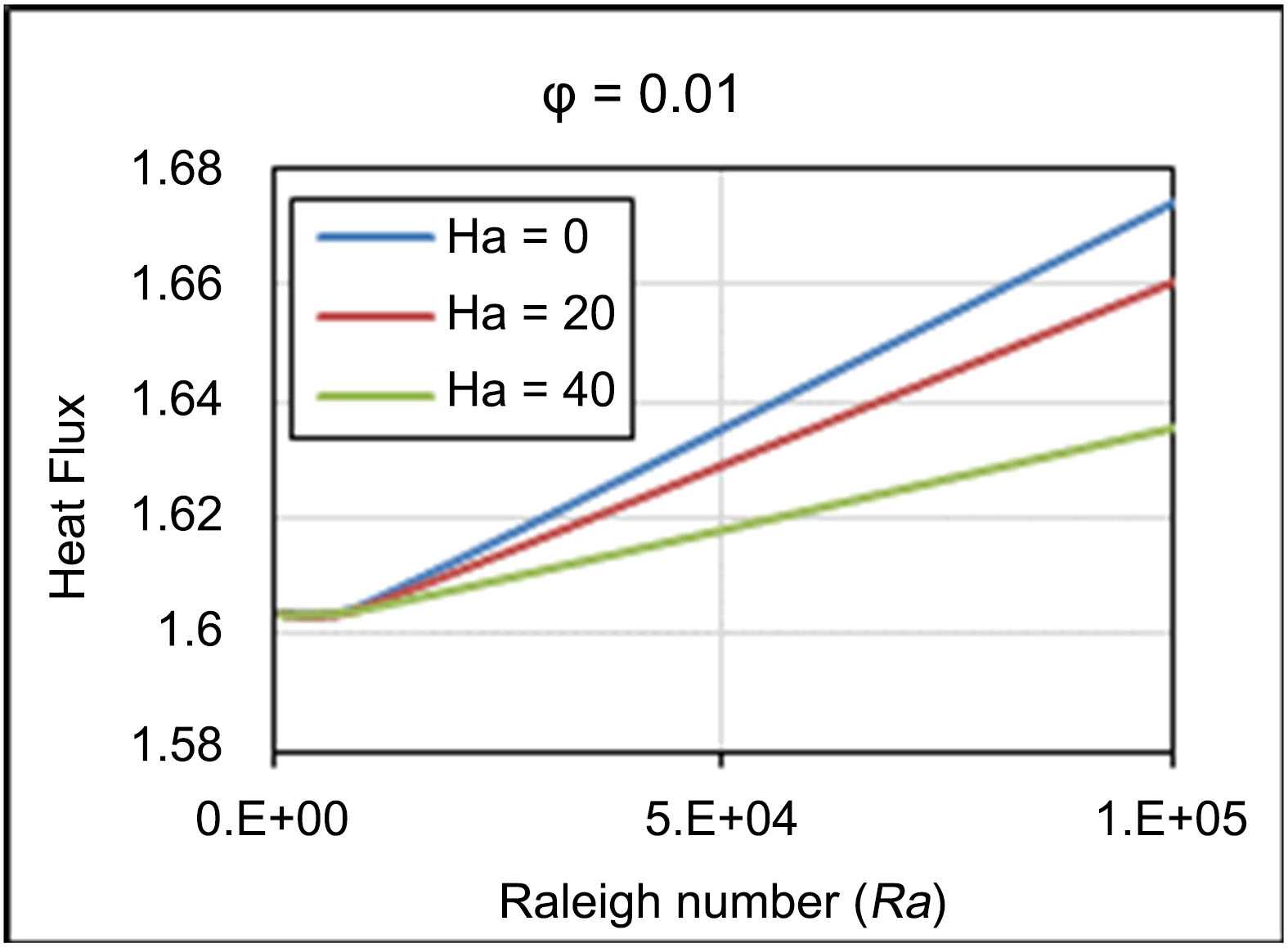 Heat flux: It is seen that in the previous figures that, adding more nanoparticle retarded flow. Increasing Hartmann number also retarded flow. Adding more nanoparticle also affected temperature distribution by making the isotherms smoother. Increasing Hartmann number also had similar effect but to a lesser degree. However, these observations are not sufficient to say conclusively whether heat transfer was enhanced or not. Therefore, Heat Flux was calculated for different values of Ra, Ha, and φ. The results are presented next in Figure 9.