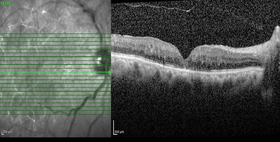 Figure 5. OCT of the right eye at 3 months after three intravitreal aflibercept injections, showing complete resolution of the edema and restoration of architecture with ellipsoid zone disruption.