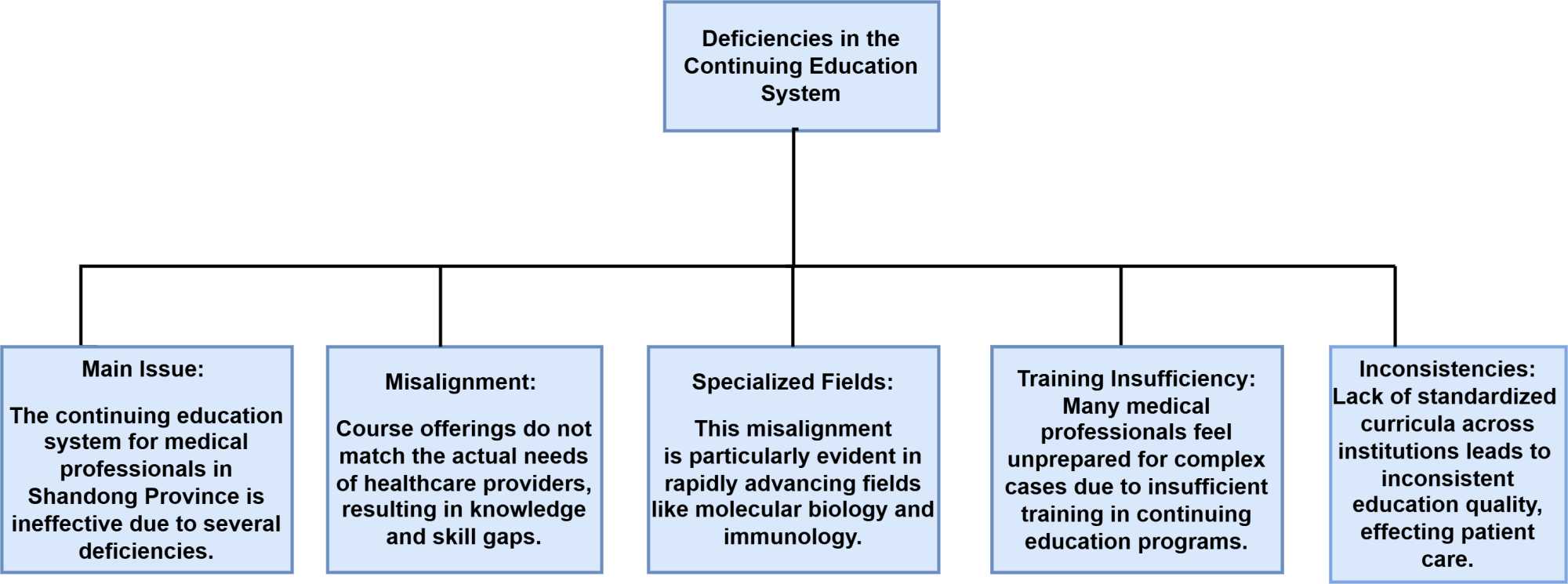 The continuing education system for medical professionals faces significant deficiencies that hinder its effectiveness in Shandong Province. One of the primary issues is the misalignment between course offerings and the actual needs of healthcare providers. The curriculum often fails to reflect the latest advancements in medical science and the evolving healthcare landscape, resulting in a gap in knowledge and skills among practitioners. This misalignment is particularly evident in specialized fields where rapid advancements occur, such as molecular biology and immunology. For instance, studies have shown that many medical professionals report feeling inadequately prepared to manage complex cases due to insufficient training in their continuing education programs [3]. Furthermore, the lack of standardized curricula across institutions leads to inconsistencies in the quality of education received by healthcare workers, ultimately affecting patient care quality (see Figure 1).