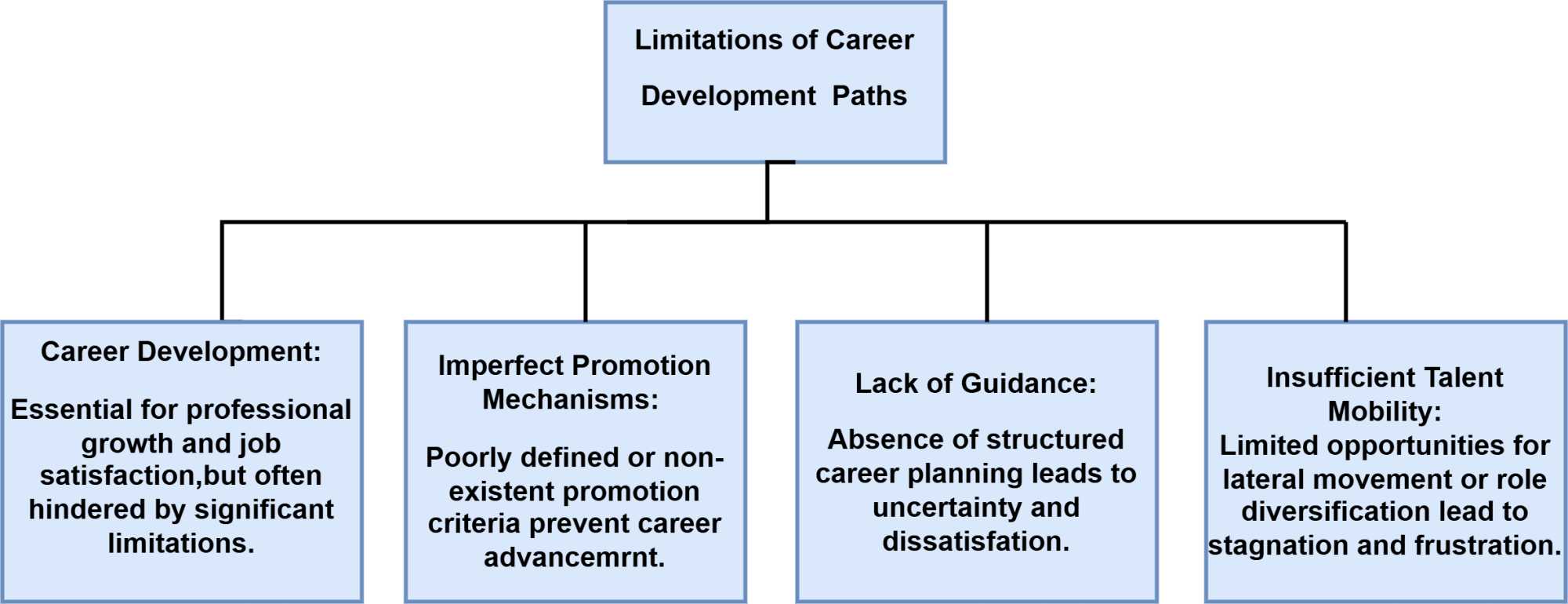 Career development paths are essential for professional growth and job satisfaction, yet they often face significant limitations that hinder individuals from reaching their full potential. Understanding these limitations is crucial for both organizations and employees to foster a more supportive and effective career development environment (see Figure 2).