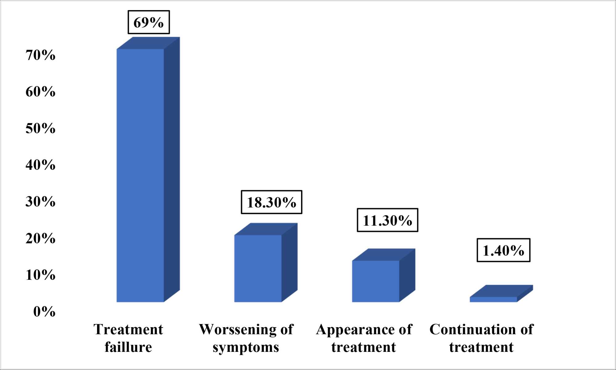 Figure 2 shows the distribution of patients according to their reasons for discontinuing self-medication. The ineffectiveness of treatment and worsening symptoms are the main reasons that ultimately prompt patients to seek medical advice.