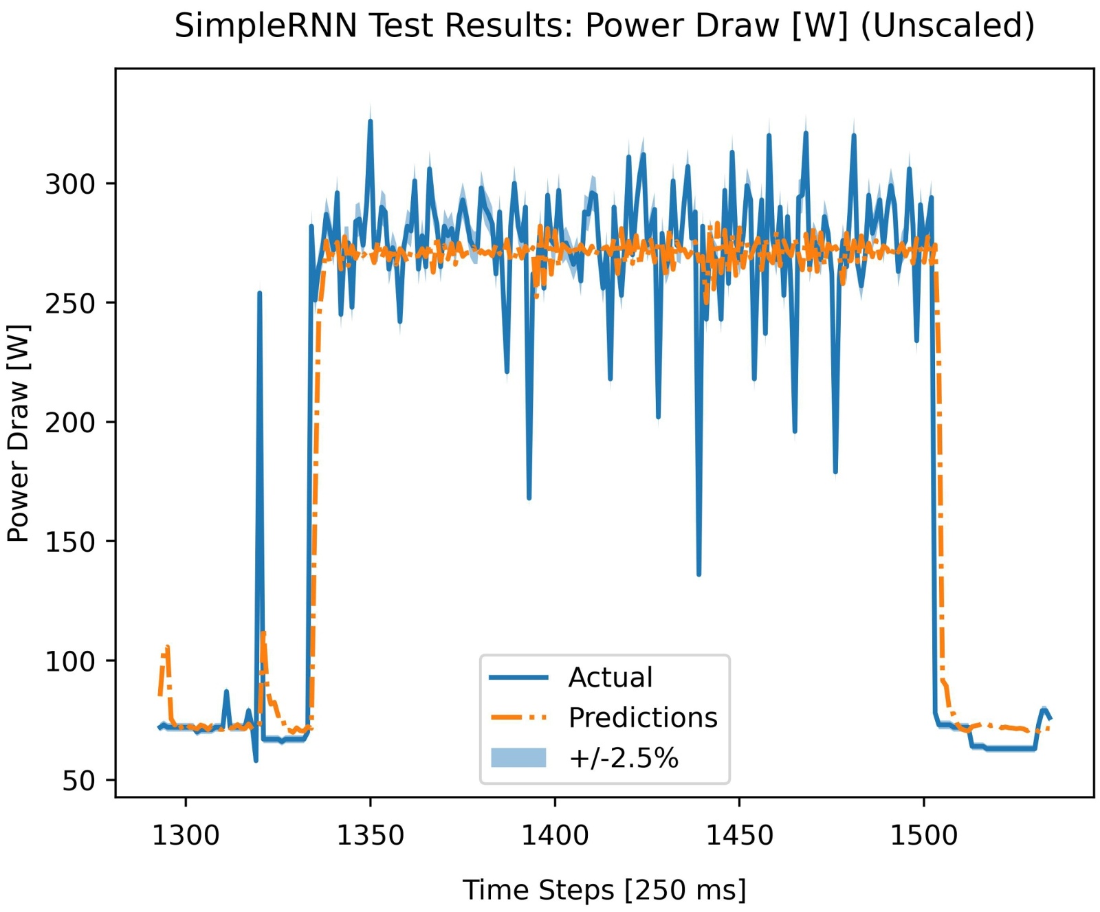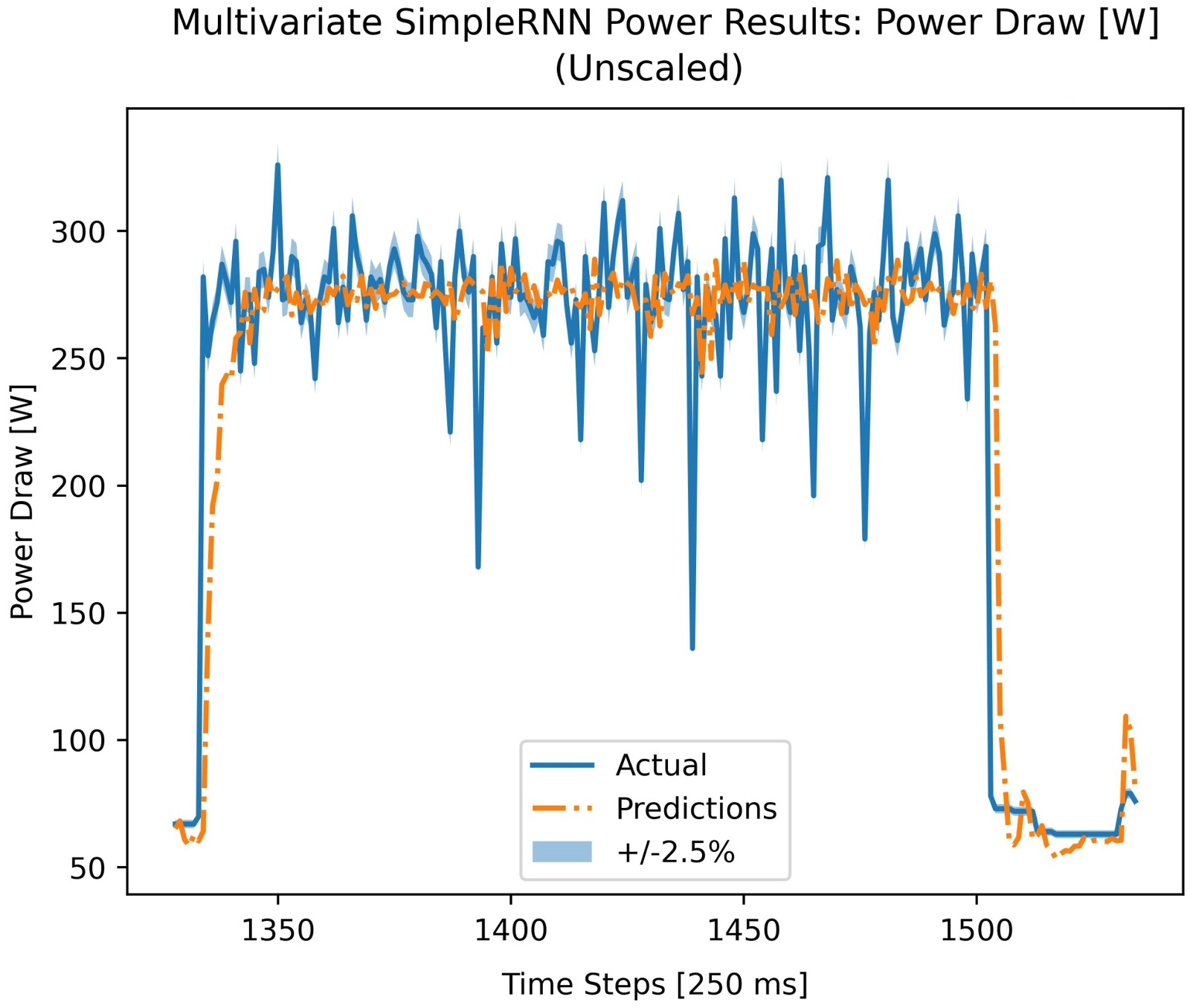 Power draw is an inherently noisier and more complex signal than utilization. It fluctuates based on the specific kernel being executed, memory access patterns, and thermal conditions. The TNN’s self-attention mechanism, which allows it to weigh the influence of all points in the context window rather than just recent steps, is better equipped to identify the complex, non-sequential patterns within this noisy data. Furthermore, the model’s probabilistic output is a key advantage. As seen in Figure 6 and Figure 7, the uncertainty bands appropriately widen during volatile periods and contract during stable ones. This ability to quantify uncertainty is invaluable for a stochastic signal like power draw.