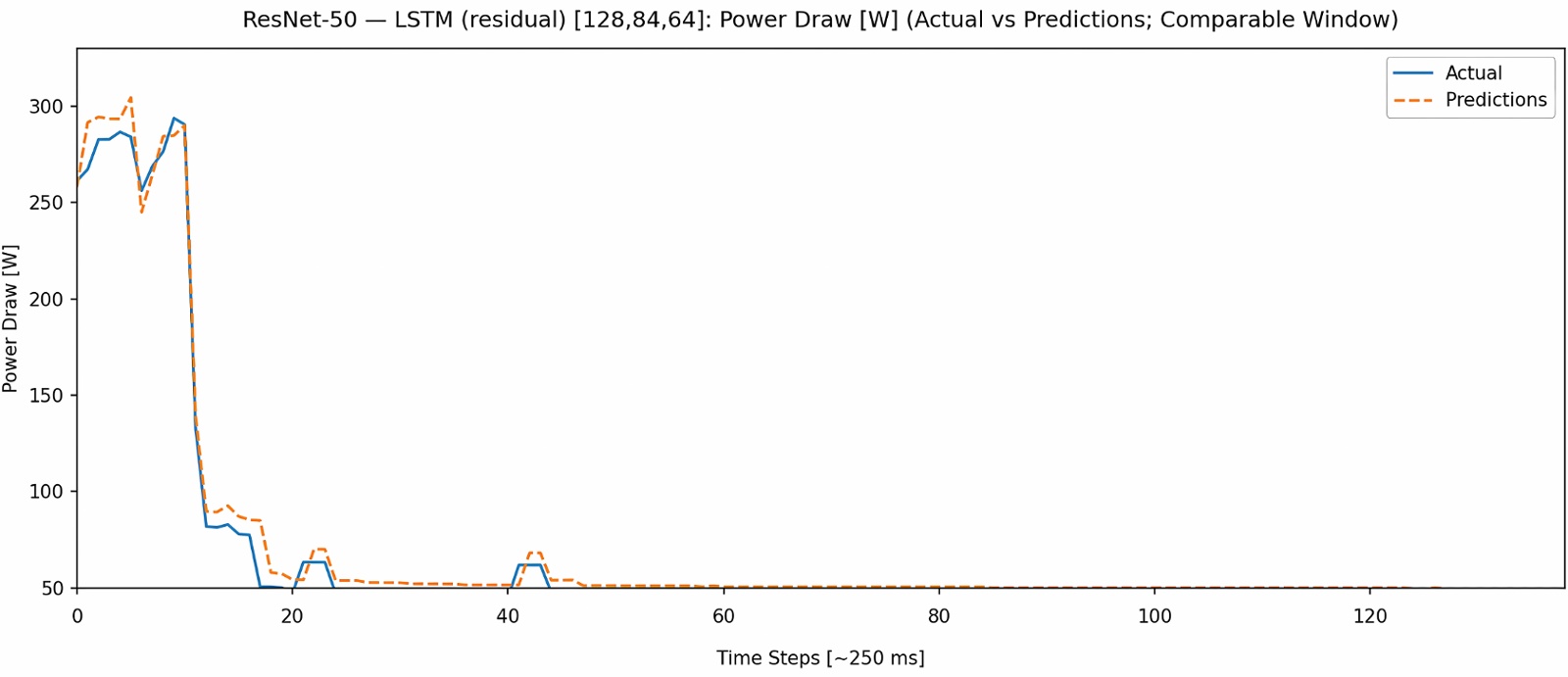 The sequential, stateful nature of RNNs is exceptionally well-suited to modeling GPU utilization. Utilization traces are often characterized by sharp, distinct transitions between idle and active states. An RNN’s ability to maintain a “memory” of the immediately preceding state allows it to precisely capture the timing of these step-changes. The slightly better performance on ResNet-50 (relative to Inception-v3) may be attributed to its more regular and predictable computational graph, which consists of sequential convolutions, making the on/off utilization pattern even easier for a sequential model to learn.