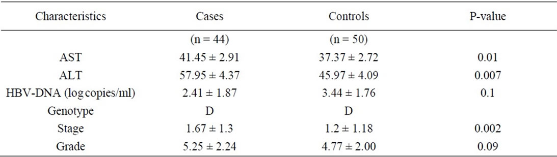 Ninety four chronic hepatitis B patients who were referred to the Digestive Disease Research Centre (DDRC) of Shariati Hospital from Jan 2006 to Jan 2009 were enrolled in a nested case-control study. The mean ± SD of age was 43.24 ± 12.22 years. Patients with other liver diseases such as hepatitis C and autoimmune hepatitis were excluded from the study.
