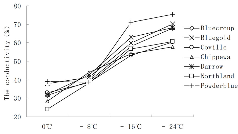 As the temperature lowers, annual branches of all cultivars suffer more and more injuries and the conductivity also significantly increases, but there exists a certain differences for different cultivars at different temperatures. When the temperature reaches −16˚C - −24˚C, the injury as a result of low temperature to all cultivars declines, and the annual branches are not dead; however, the conductivity of all cultivars has reached 57.82% - 75.29%. From Figure 2, we can see when it is 0˚C - 8˚C, low temperature causes the most injuries to Northland and Chippewa and conductivity increase is the biggest, which is up to 0.5842 times and 0.5454 times, while the increase of Powderblue is the least, which is only 0.0008 times; when it is −8˚C - 16˚C, low temperature causes the least injuries to Northland and Chippewa, which is 0.4885 times and 0.2294 times, but low temperature causes the most injuries to other cultivars, of which the conductivity increase of Powderblue is the biggest, up to 0.8554 times; when it is −8˚C - −16˚C, most cultivars suffers the most; When it is −16˚C - −24˚C, the injury due to low temperature to all cultivars declines, but the conductivity of different cultivars has been up to 57.82% - 75.29%, which suggests that when it is −24˚C, the in vitro tissues of all cultivars have been seriously injured,