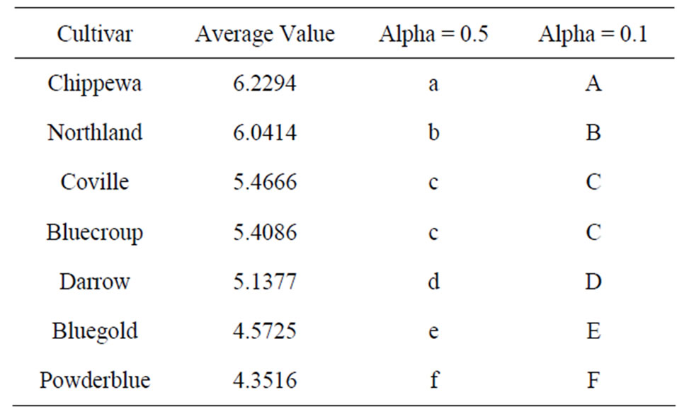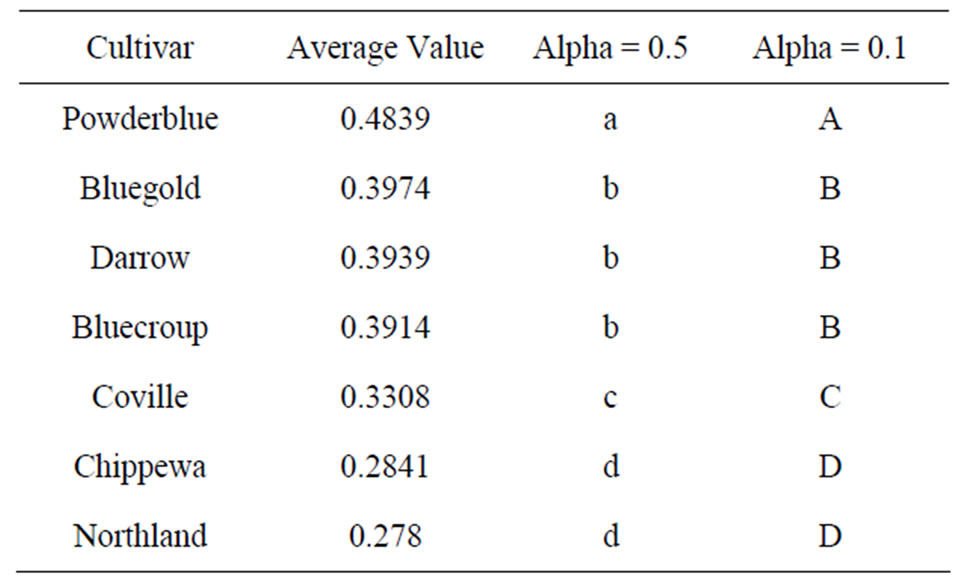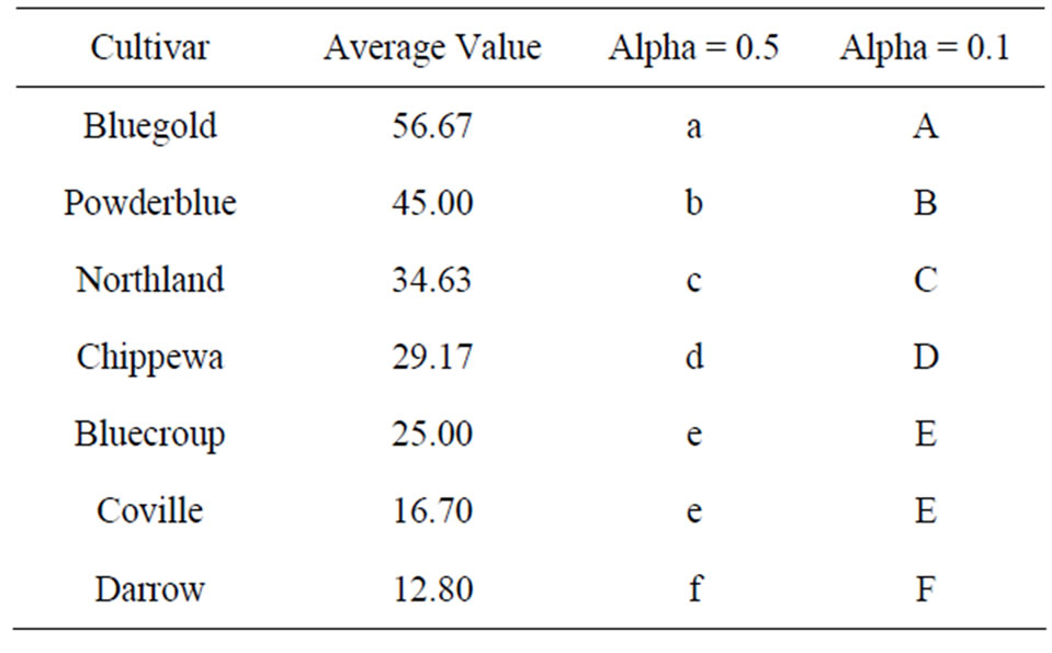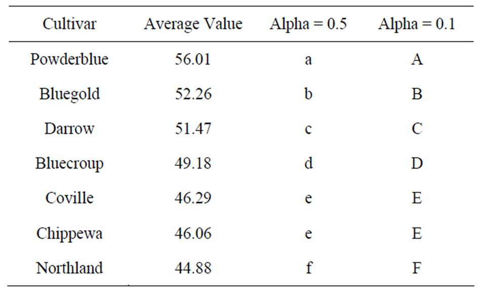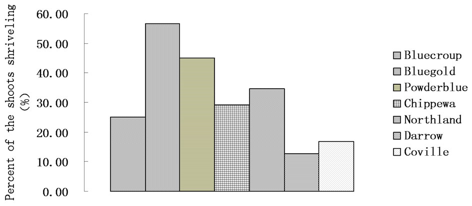 the membrane permeability is destroyed and most electrolyte in the cell leaks especially the leakage rates of electrolytes of Powderblue and Bluegold, which are above 70%. After analysis of variance on freeze injury degree, there is significant difference between all cultivars. Based on the conductivity values in Figure 1, we can draw a conclusion that the resistances of 7 cultivars of blueberries are different and the sequence from high to low is Northland > Chippewa > Coville > Bluecroup > Darrow > Bluegold > Powderblue.