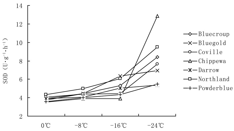peroxide free radicals. After variance analysis, the SOD content of the same cultivar at different low temperature is significantly different. As can be seen from Figure 3, the law of the SOD content of every cultivar changing with the decrease of temperature is different. The SOD content of Bluegold and Darrow increase most rapidly at −8˚C to −16˚C, which amounts to 41.79% and 24.39% respectively, and increase relatively slow at the low temperature of 0˚C to −8˚C. However, the SOD content of annual branch of other 5 cultivars increases most rapidly at −16˚C to −24˚C. From the perspective of cultivar, SOD content of annual branch of Chippewa can still amount to 12.872 U·g−1·h−1 at temperature down to −24˚C while that of Powderblue is only 5.4907 U·g−1·h−1. Therefore, under low temperatures stress, SOD activity is positively correlated with cold resistance of different cultivar, i.e. the higher of cold resistance ability of different cultivar, the higher the SOD activity and vice versa. The hardiness of the 7 cultivars is: Chippewa > Northland > Coville > Bluecroup > Darrow > Bluegold > Powderblue.