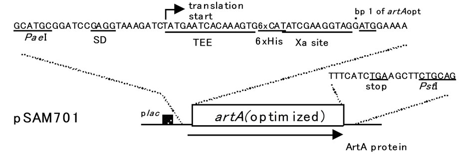 Synthesis of the artA gene (GenBank accession U01159) was carried out by GenScript after codon usage bias adjustment with OptimumGeneTM. The artificial artA was in the following context (Figure 1): Pae I restriction site, SD sequence, translation enhancing element [9], sequence encoding the hexahistidine (6xHis) tag for affinity purification, factor Xa cleavage site, codon-optimized artA, and Pst I restreiction site. Nucleotide sequence of the synthetic artA will be supplied on request. The fragment was digested with Pae I and Pst I and cloned into pUC57 which had cut with Pae I and Pst I, generating pSAM701. In pSAM701, the lac promoter of the vector