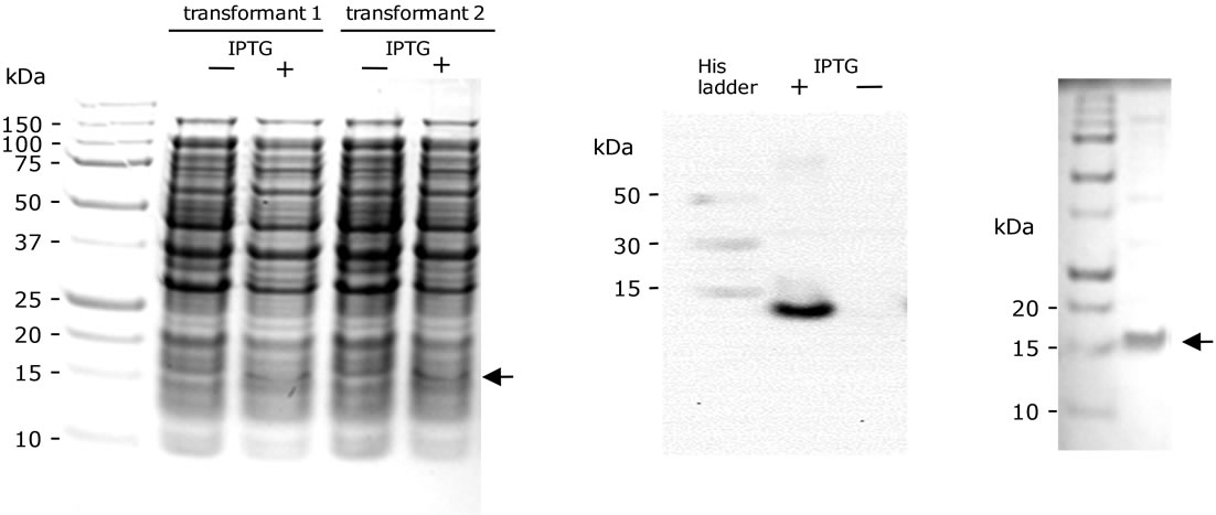Figure 3. Analyses of the proteins expressed in SG13009 cells having pRep4 and pSAM701. Electrophoresis of proteins was carried out using SDS-12% polyacrylamide gels [11]. (a) Cells from two transformants were incubated with or without IPTG, and the whole cell lysates were electrophoresed. An arrow indicates the position of ArtA. (b) A Western blot of the whole cells incubated with or without IPTG. 6xHis Protein Ladder (Qiagen) was used as a positive control for transfer and detection, and for size determination. (c) Electrophoresis of the protein sample obtained after nickel chelate affinity chromatography and dialysis.