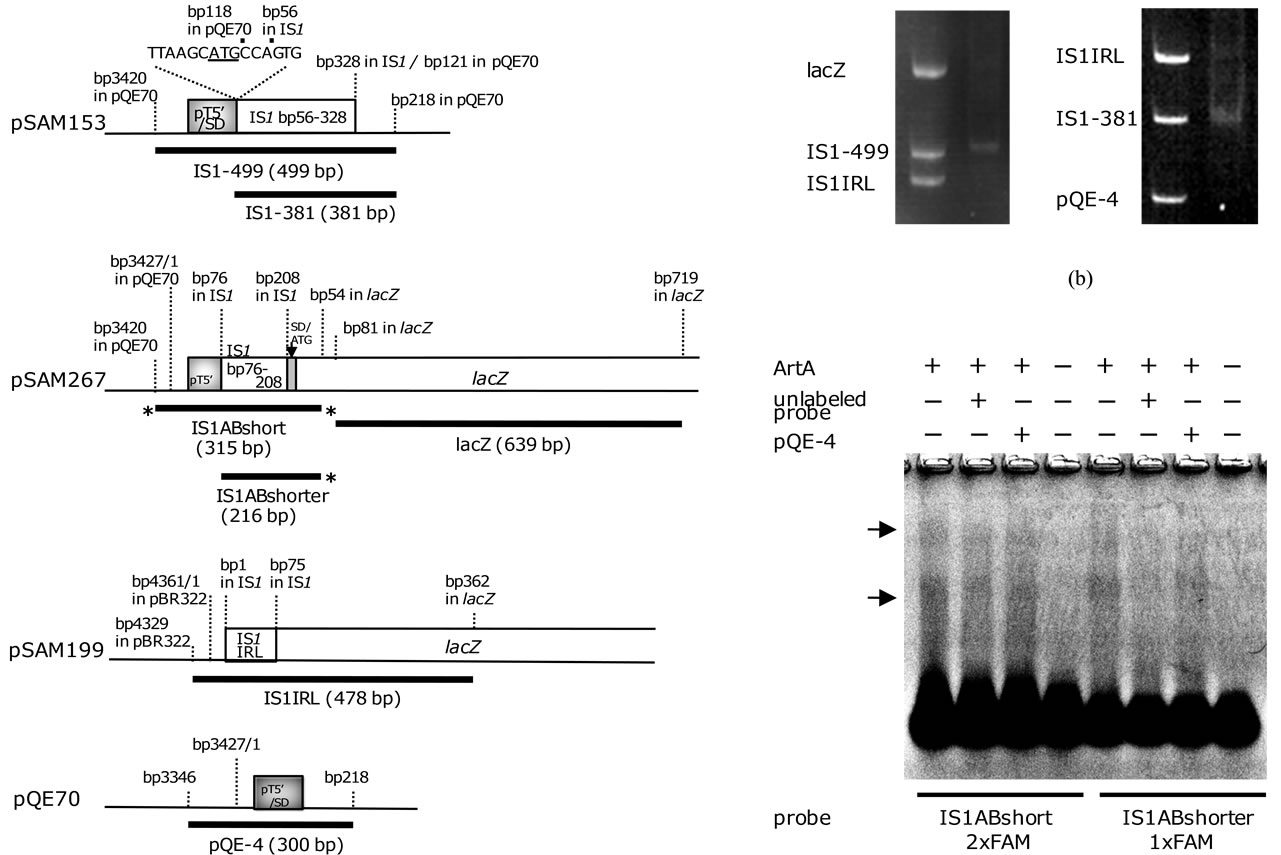 Figure 2. Binding assays of ArtA to the DNA fragments. (a) Structures of the plasmids used for PCR amplification. The amplified regions are shown as thick lines below the structures, and the PCR products were used for assays. Asterisks indicate the positions of 6FAM; (b) Results of nitrocellulose filter binding assay. In each gel, the mixture of PCR products before filtration (left lane) and the DNA fragment retained on the membrane after filtration (right lane) are shown. Small aliquots of the PCR product mixtures just before incubation with ArtA were electrophoresed with the retained fragments for exact comparison. Two mixtures were used: lacZ, IS1-499, and IS1IRL (left gel); and IS1IRL, IS1-381, and pQE-4 (right gel). 5% polyacrylamide gels were used. (c) Result of EMSA. The probe IS1ABshort (2xFAM) was prepared by PCR amplification using 5’-6FAM labeled M5 and 5’-6FAM labeled QE3 primers from pSAM267 (Table 1). In the preparation of the probe IS1ABshorter (1xFAM), IS1AB-1 and 5’-6FAM labeled M5 primers were used (Table 1). Unlabeled IS1ABshort and IS1ABshorter probes were prepared by PCR amplification using M5 and QE3 primers and M5 and IS1AB-1 primers from pSAM267, respectively (Table 1). The pQE-4 fragment was used as a non-specific competitor. ArtA-DNA complexes were formed as described in the text. After electrophoretic separation in 1.2% agarose, the gel was scanned by the fluorescent image analyzer FLA3000. Arrows show the shifted bands.