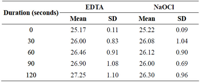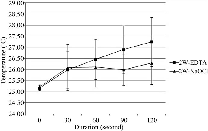 The mean (standard deviation) root canal temperature at 0, 30, 60, 90, and 120 seconds after application of the 2 W laser in the presence of EDTA irrigant was: 25.16 (0.11), 26.36 (0.54), 26.45 (0.91), 26.89 (1.08), and 27.24 (1.10)˚C, respectively.