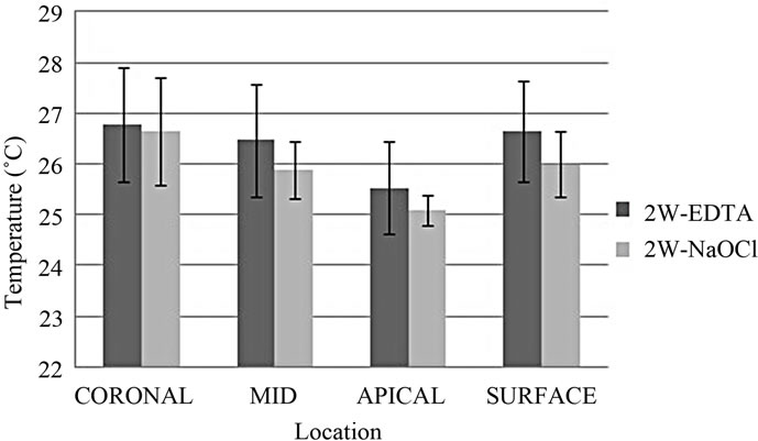 Laser agitation in the presence of the EDTA irrigant produced significantly higher temperatures than the NaOCl irrigant (p < 0.001) (Figure 3). Differences in the physical properties of NaOCl and EDTA might have an effect on the transmission of laser energy by the solution. In fact, during cavitation, more microbubbles formed in the NaOCl solution than in the EDTA solution. The authors assumed that this enhanced formation of microbubbles might have reduced the magnitude of the temperature change. Further research is needed to show which of the physical properties of the NaOCl solution is responsible for the lower rise in the temperature.