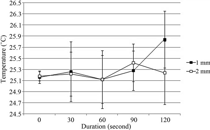 Furthermore, there was no significant difference in temperature at the root surface between the wall of 1 mm thickness and that of 2 mm (Figure 4). Under the conditions of the study, high temperatures were not recorded in the outer canal, and dentin, which is a poor conductor of heat, insulated the surface of the tooth from the temperature changes within the root canal. The thicker root canal wall was a more efficient insulator, but the difference was not significant.