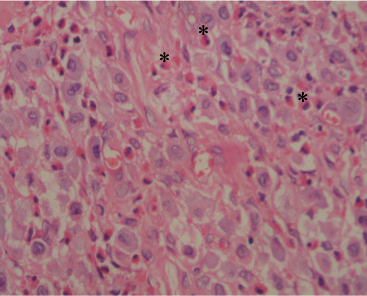 Figure 1. Sheets of mast cells admixed with eosinophils (*) (H & E ×200).