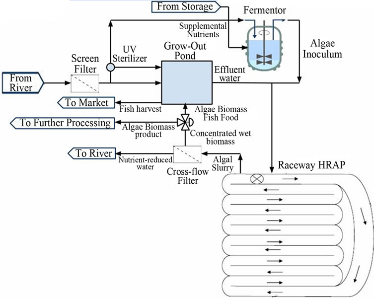 Figure 3. PFD of integrated algae-aquaculture system (HRAP image credit: [31]).