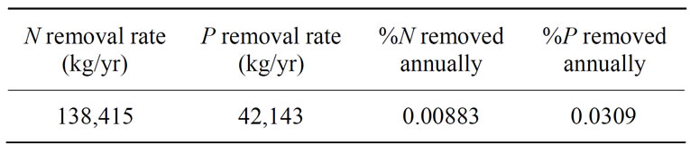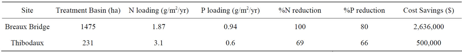 A hydrodynamic model of nutrient loading in the Maurepus forested wetland in Louisiana was used to assess the nutrient removal potential of a proposed Mississippi River diversion into the wetland [19]. It was estimated that the diversion would result in a 90% - 95% reduction of introduced nitrate by the wetlands. Given the anticipated water quality improvements, the study suggested that plans for the diversion move forward. An assessment of the denitrification efficacy of the Breton Sound estuary, a wetland already receiving diverted Mississippi River water, found that average removal rates were between 21 and 32 g N/m2/yr, which indicated that the estuary was capable of processing significant quantities of nitrate from the Mississippi [20]. Wetlands are so effective at nutrient removal that they are sometimes used as methods of tertiary water treatment, receiving effluent directly from wastewater treatment plants. Conventional tertiary treatments methods are often very expensive; wetland assimilation can provide an effective, low-cost alternative if geographically feasible. Day Jr. et al. [18] compiled a list of different wetland treatment projects undertaken in coastal Louisiana using data compiled from multiple studies of the individual sites. A selection of site-specific data on nutrient removal, as well as estimated cost savings over a 20-year period (compared to conventional treatment methods) to the communities can be seen in Table 1.