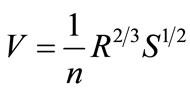 The raceway pond is where the system will perform its primary function of nutrient assimilation. Unless a lowcost source of CO2, such as a coal-fired power plant, is located near the pond, it will be assumed that paddlewheel mixing and turbulence will be the sole facilitators of mass transfer for the system. When performing design calculations for the HRAP, multiple equations found in a reference text [43] were used. Equation (3) is Manning’s equation, where V is the mean velocity (m/s), R is the mean hydraulic radius (m), S is the rate of energy loss per unit length (dimensionless; can be split into Δd/L), and n is Manning’s friction coefficient (s/m1/3). Equation (4) is an equation developed from empirical observation of large-scale open pond algae cultures where CC is the light-limited algae concentration on a dry weight basis (mg/L) and d is the pond depth in centimeters. Equation (5) is obtained from a differential mass balance on the pond where C0 is entering concentration, μ is specific growth rate, and tr is retention time. Equation (6) is the standard dilution equation, adapted for the transition of