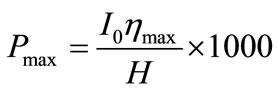 The theoretical maximum algae biomass productivity in g/m2/day (Pmax), assuming ideal conditions, can be estimated using Equation (4), where I0 is the average solar radiation in MJ/m2/day, ηmax is the maximum efficiency of photosynthetic conversion of solar energy, and H is the energy value of the algal biomass in kJ/g [30].