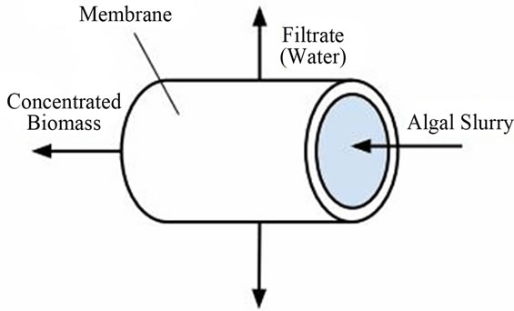Cross-flow filtration is a conventional purification method in which a pressure gradient forces a fluid mixture flowing across a membrane to separate; it has been successfully utilized for separation of microalgae slurry [46], and an economic study of its utility in an industrialscale algal dewatering process estimated costs at around $0.75/kg dry biomass [47]. Cheaper options exist when chemical pretreatment of the algae slurry or dynamic filtration using a rotor are considered; however, those practices may not support the project’s goal of minimal environmental impact.