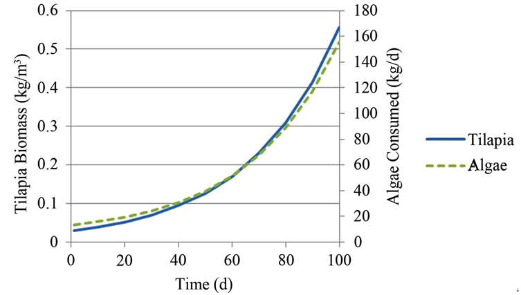 A culture period of 100 days was assumed based on harvesting recommendations in [33]. At harvest time, the pond will be partially drained and seine nets with a 1- inch mesh will be used to capture the fish. The amount of labor required for this task is dependent on the optimal pond area. In addition, the authors advocate a pond size between 1 - 10 acres for extensive operations; for ease of management, a 5-acre pond was decided upon for this design. The tilapia-algae relationship for such a pond over the recommended culture period can be observed in Figure 4.