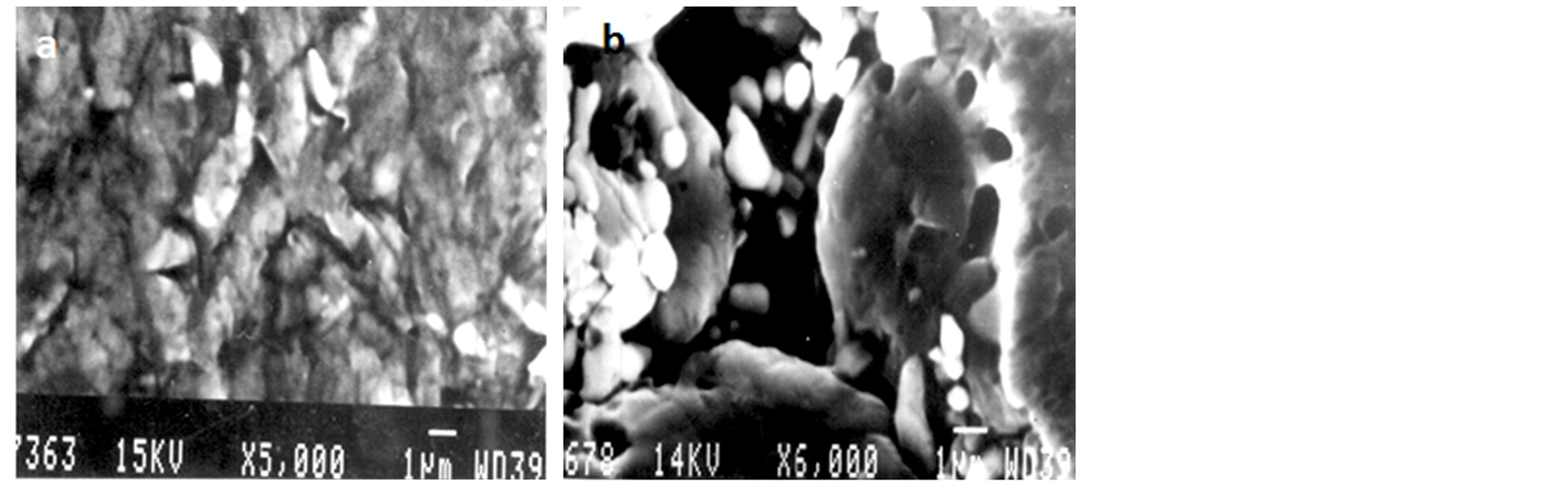 Figure 6. (a) Aluminium 5 wt% alumina green compact compressed at 290 MPa. Inter separation distance between aluminium powders is less than 100 mm; (b) Aluminium 15 wt% alumina green compact compressed at 290 MPa. Inter separation distance has increased to 4 mm.