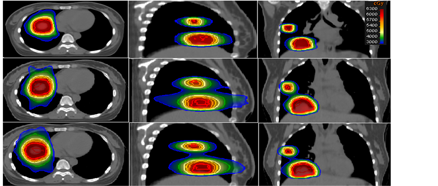 There have been reports which relate the clinical efficacy of SBRT over different fractionations to a BED cutoff. Thus, Onishi, et al. [10] reported that improved local control and survival are associated with SBRT regimens whose BED is >100 Gy. In other words, the purpose of SBRT treatment is to produce a higher tumor control intent and safer outcome with possible minimum complications. The recognition of dose escalation for hypofractionated treatment has gained popularity in recent years, with many clinical implementation, presented the successful local control of metastatic lung disease treatment [11] -[13] .