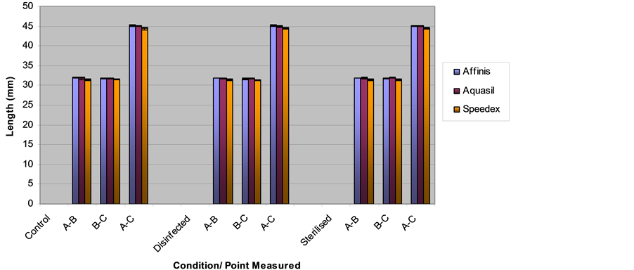Speedex is a condensation-cured silicone therefore the differences observed between this material and the two addition-cured materials may be due to the different setting reaction which decreases the overall dimensional accuracy. These differences between the materials were not due to the sterilisation procedure, as differences were noted across all the conditions for each distance measured. Therefore, sterilisation and disinfection did not cause significant changes between the impression materials. Affinis and Aquasil are addition cured impression materials, which undergo minimal shrinkage post setting and are dimensionally stable.