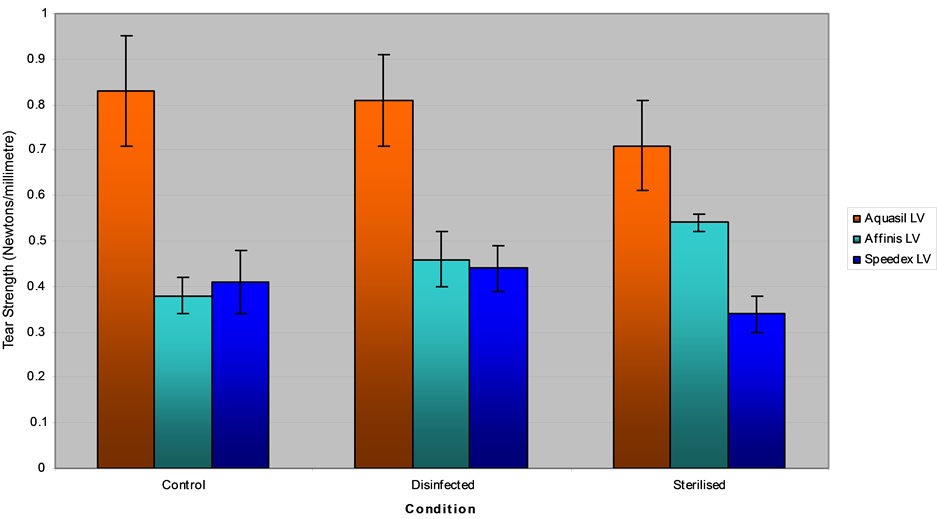 significant difference existed between the control and sterilised group (p = 0.047) but not between the control and disinfected group (p = 0.909) nor between the disinfected and sterilised group (p = 0.111). A significant difference (p = 0.001) was observed between the three treatment groups for tear strength. A Tukey test showed a significant difference between the control and sterilised group (p = 0.022) and between the disinfected and sterilised group (p = 0.001) but not between the control and disinfected group (p = 0.449) when all impression materials were considered together.