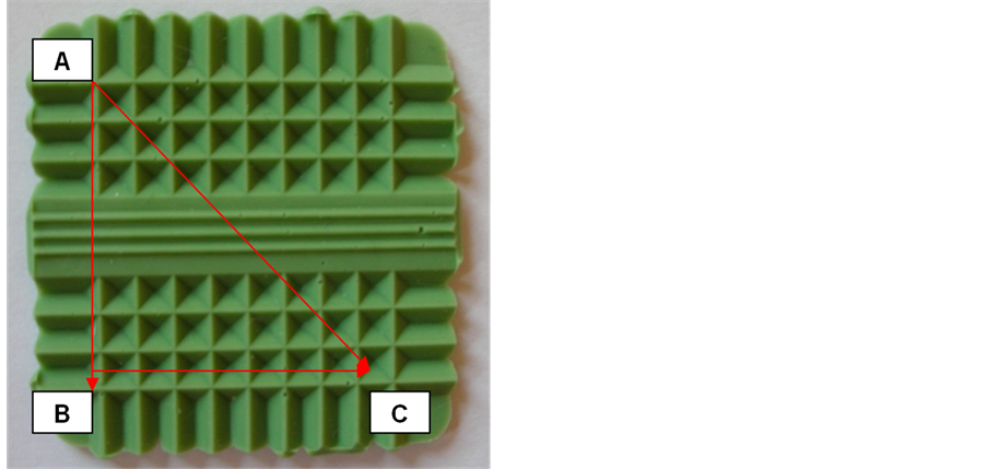 The specimens prepared for the dimensional stability tests were analysed using a non-contact scanner (Tai Caan Ltd.), scanned at 100 microns then stored in a CPU for analysis. Three linear measurements were taken from each specimen (A-B, B-C and A-C) as shown in Figure 1. This was repeated for all the specimens within a group and the mean was calculated.