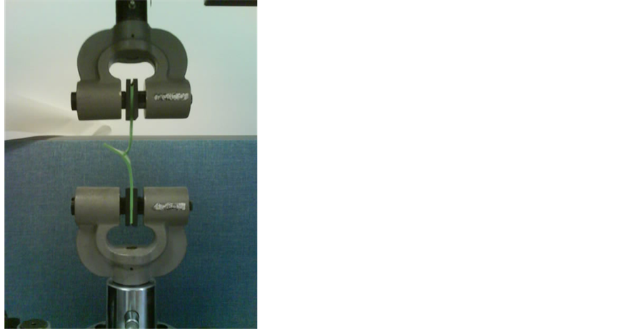 The tear strength tests involved using the “trouser-piece” method. This involved clamping the opposing “tongues” of the tear strip into the Instron (1995) machine, calibrated to move at 10 mm per minute. The clamps would move in opposite directions until a tear was initiated and maintained (Figure 3). The maximum force exerted to initiate a tear was measured electronically. The tear strength was calculated as the force required to initiate the tear divided by the specimen thickness (Tear strength = Force (Newton’s)/Thickness (Millimetres)).
