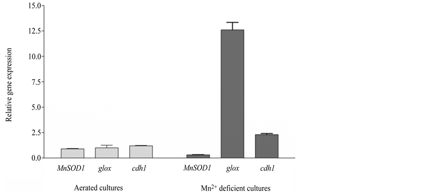 Figure 3. Expression of H2O2 producer enzymes in Mn2+-deficient high LIP- producing cultures in comparison to aerated low LIP-producing cultures. The expression of MnSOD1, glox and cdh1 transcripts relative to 18S rRNA gene transcript was measured by real-time PCR. The means ± SD (error bars) of six replicates are shown.