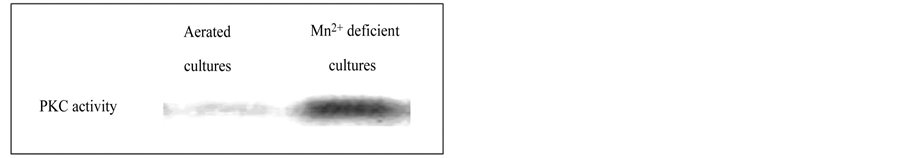 Figure 4. PKC activity in aerated and Mn2+-deficient cultures. Protein sam- ples (5 µg) were assayed for PKC activity using the PepTag non-radioactive kit (Promega). The reaction was performed for 30 min at 30˚C. The non- phosphorylated peptide substrate was then separated from the phosphorylated substrate by electrophoresis on 0.8% agarose gel. PKC activity was estimated by the fluorescence intensity of the band corresponding to the non-phos- phorylated substrate. Intense band represent low activity of PKC.