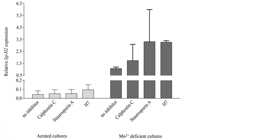 Figure 5. Influence of PKC inhibition on lip-H2 transcription in cell extracts of Mn2+-deficient cultures. The PKC inhibitors (40 ng/ml staurosporin A, 122 ng/ml calphostin C or 5 µg/ml H7) were added to 120-h-old aerated and Mn2+- deficient high LIP-producing cultures for 2 h. The expression of lip-H2 tran- scripts relative to 18S rRNA gene transcript was measured by real-time PCR. The means ± SD (error bars) of six replicates are shown.