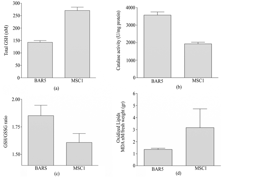 To understand whether the oxidative stress in Mn2+-deficient cultures, needed for LIP expression [7] [8] , is caused by the deficiency of Mn2+ or by low MnSOD activity or a combination of them, MnSOD silenced mutants (MSC), prepared as previously reported in [18] , were used. The MSC mutants were grown in the presence of Mn2+ and molecular oxygen. Significantly higher level of oxidative stress was confirmed in MnSOD silenced mutant (MSC1) in comparison to MnSOD non-silenced mutant (Bar5), by measuring lower GSH/GSSG ratio and higher level of oxidized lipids, in spite of the presence of Mn2+ in the medium. The total GSH levels measured in BAR5 and MSC1 were 142 nM and 270 nM, respectively. The GSH/GSSG ratios measured in BAR5 and MSC1 were 1.85 and 1.6, respectively (Figure 1(a), Figure 1(c)). Lipid oxidation was determined by measuring MDA levels in MSC mutants. MDA level in MSC1 was 2.5 times higher than in control BAR5 (Figure 1(d)). Catalase activity was analyzed in protein extracts prepared from the MSC mutants’ biomasses. While in BAR5 catalase activity was high (3574 U/mg protein), in MSC1 catalase activity was 1930 U/mg protein (Figure 1(b)).