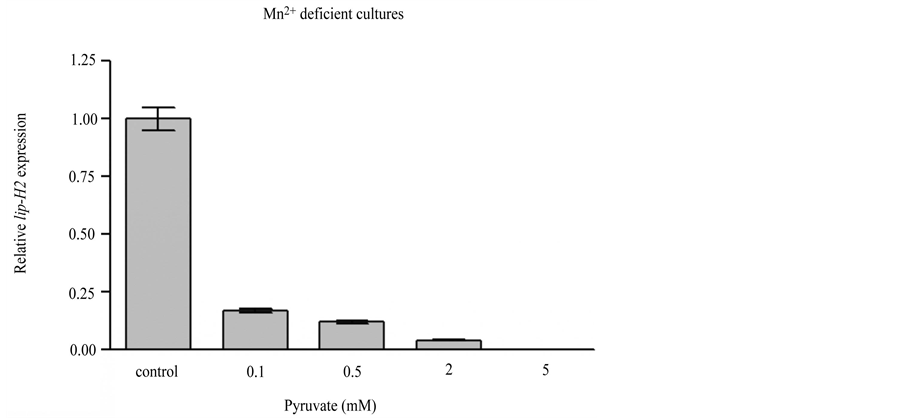 Figure 2. Influence of H2O2 scavenging on lip-H2 transcription in Mn2+ deficiency cultures of P. chrysosporium. Hydrogen peroxide was scavenged by increased concentrations (0 - 5 mM) of pyruvate. The expression of lip-H2 transcripts relative to 18S rRNA gene transcript was measured by real-time PCR. The means ± SD (error bars) of six replicates are shown.