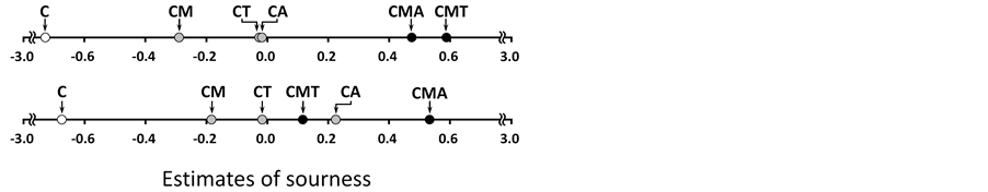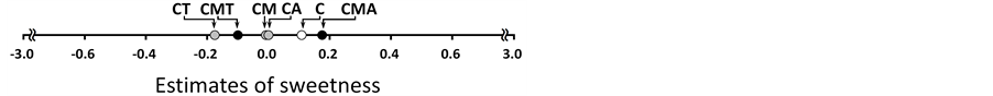 Figure 1(a) shows estimates of the sweetness of six acid solutions after oral miraculin was applied. The highest estimate of +0.17 was elicited by the trinary mixture, CMA, while the lowest estimate of −0.17 was elicited by a binary mixture, CT. The range between these estimates, 0.34, was only 5.7% of the possible parameter range (6.0; from −3.0 to +3.0), showing that the difference in the sweetness among the six solutions was relatively small. The three-way ANOVA did not detect significant differences in the “main effect (sweetness; P = 0.14)”, or in “participant (P = 0.06)”, nor in the “main × participant interaction (P = 0.86)”, and the estimate of the confidence intervals between the solutions also indicated no specific differences (Table 2, Ps > 0.05).