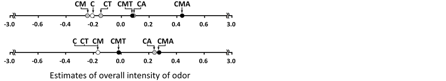 Figure 2(a) and Figure 2(b) show the estimates of astringency and the overall odorintensity, respectively, for six acid solutions after the oral miraculin was applied. The highest and lowest estimates of the astringency were elicited by the trinary solution CMT and by the single solution of C, respectively, before and after the miraculin was applied (Figure 2(a)). The highest estimates were +0.38 (before miraculin) and +0.23 (after miraculin), while the lowest estimates were −0.51 (before miraculin) and −0.35 (after miraculin). The three-way ANOVA detected significant differences both before and after the miraculin was applied (Ps < 0.01), and specific differences were also found in 10 of 30 possible pairs of the acid solutions (Table 4, Ps < 0.05). The highest overall intensity of odor was elicited by the two acid solutions, binary CA and trinary CMA, in which both contained A (Figure 2(b)). The three-way ANOVA detected significant differences both before and after miraculin was applied (Ps < 0.01), and specific differences were also found in 12 of the 30 possible pairs of the acid solutions (Table 5, Ps < 0.05).