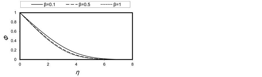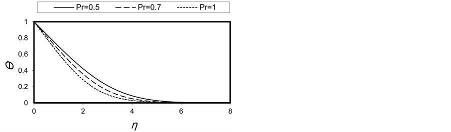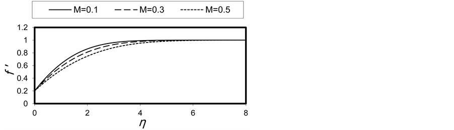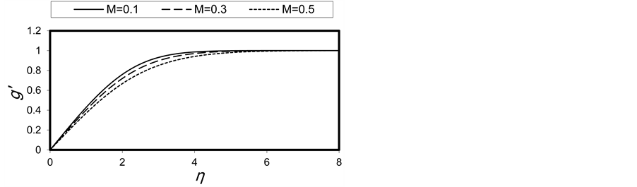 . Figure 3 clears the effect of M on the velocity profiles. It is shown that the velocity decreases with increasing M, also it decrease with increasing